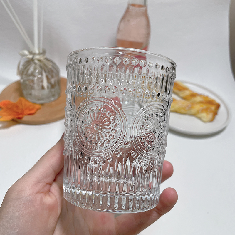 Ins style Nordic retro embossed sun flower glass European round transparent drink glass milk cup small fresh