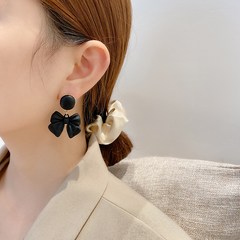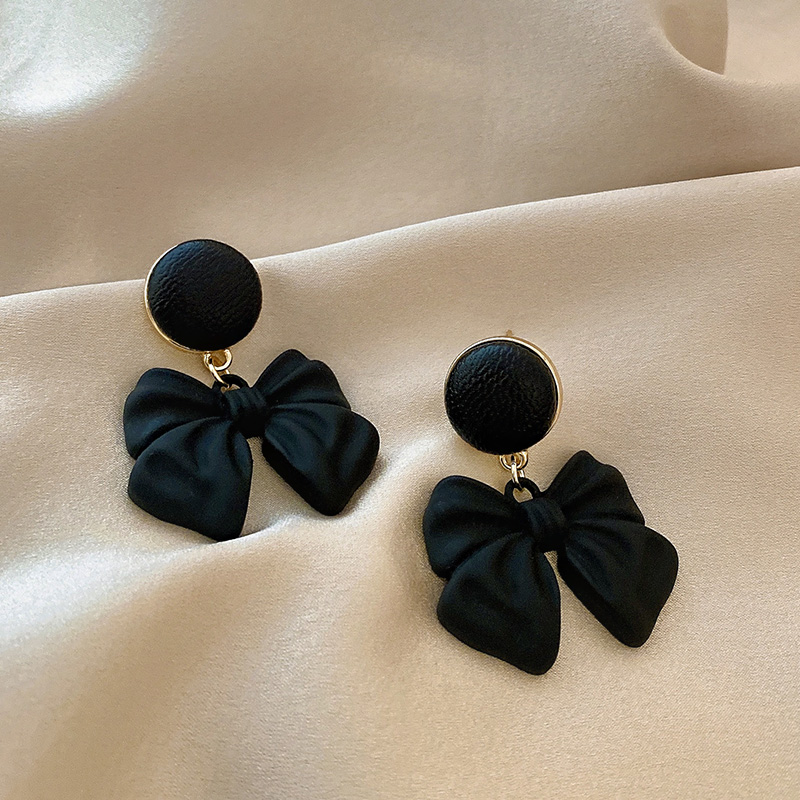 Black abstinence ~ high-level sense ~ circle ear pin black bow earrings solid color temperament modified round face earrings