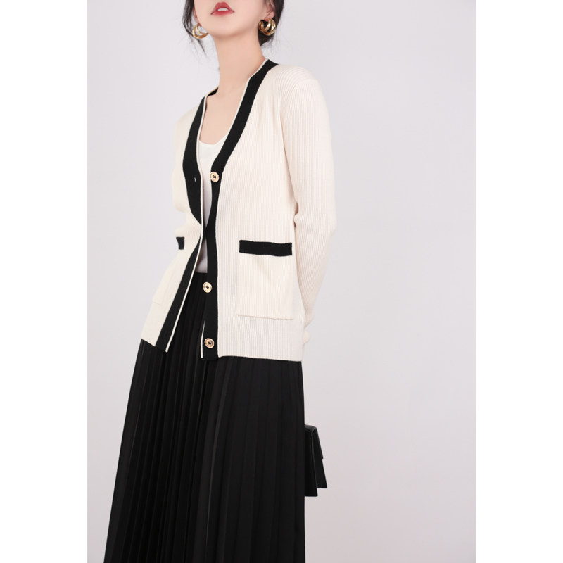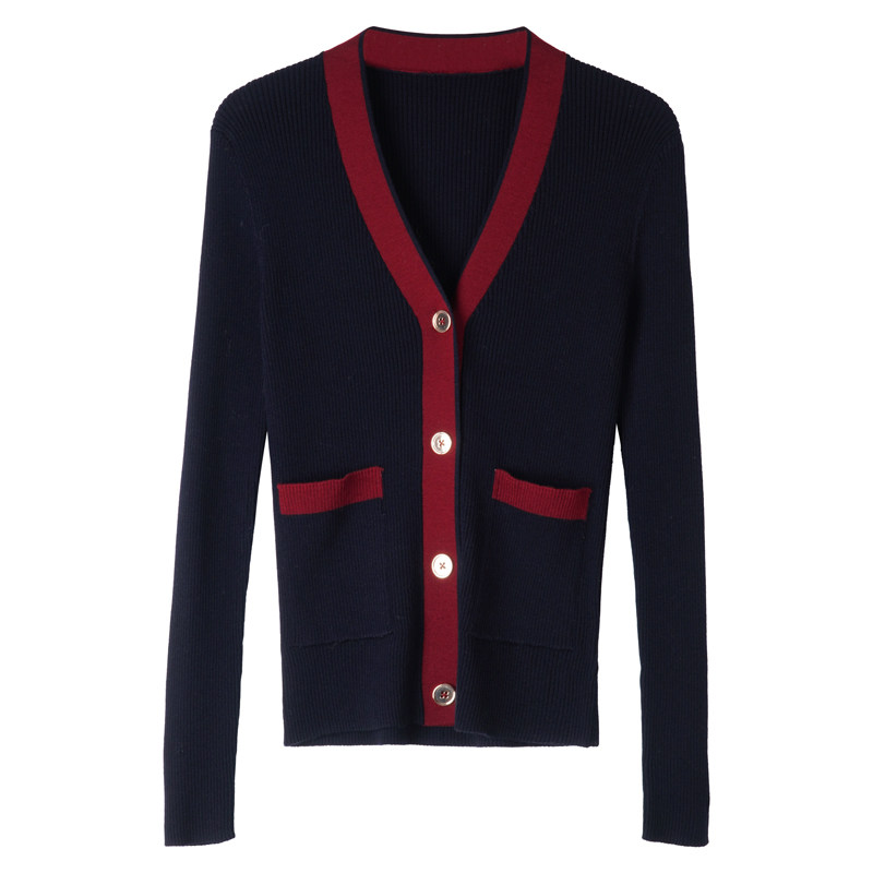 Ma's Jiamin 2022 New products 48 fine-spun wool small fragrant wind display slim V collar hit color knit cardiovert 611008
