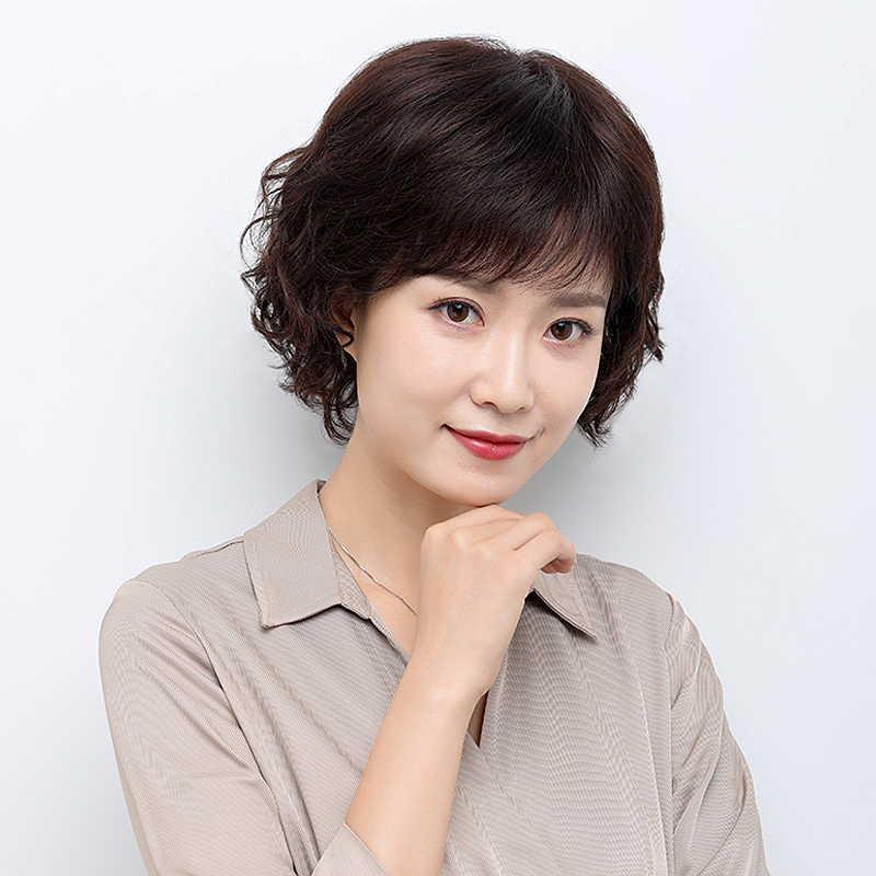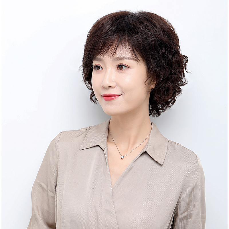 Middle-aged and elderly mother wig female short hair curly hair fluffy breathable perm hairstyle real hair full real luminous head headgear
