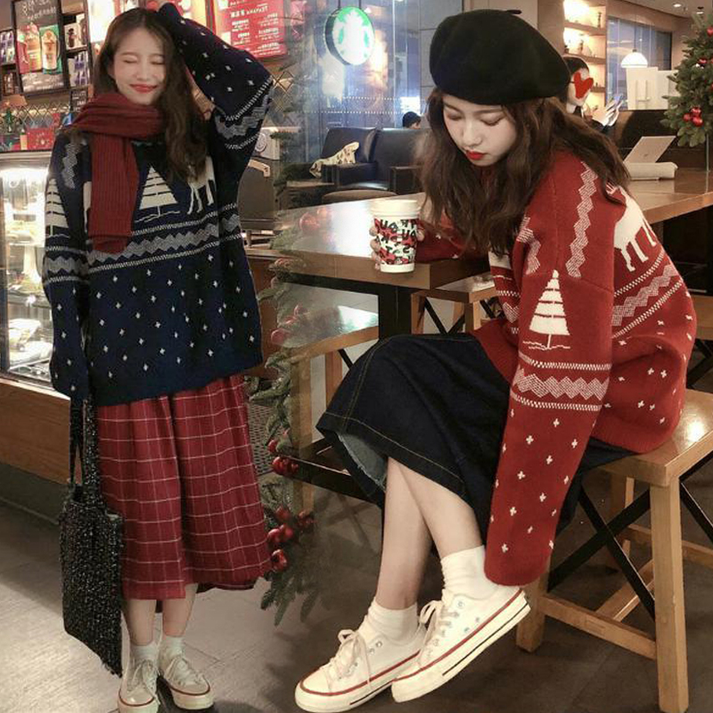 Blue sweater red sweater blue black broadlegged pants red black broadlegged pants