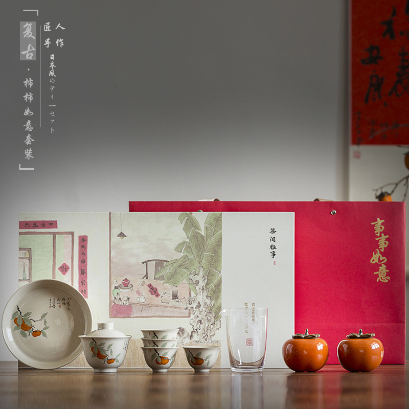 Green persimmon and persimmon Ruyi gift box set Persimmon Ruyi tea set-five-piece persimmon persimmon Ruyi tea set-six-piece tea tray