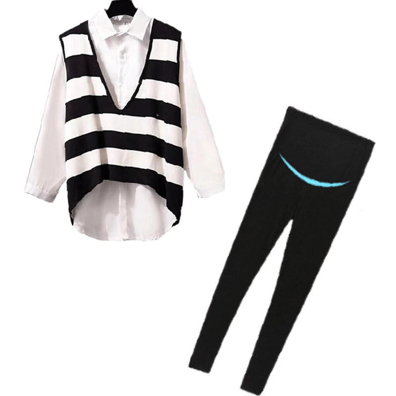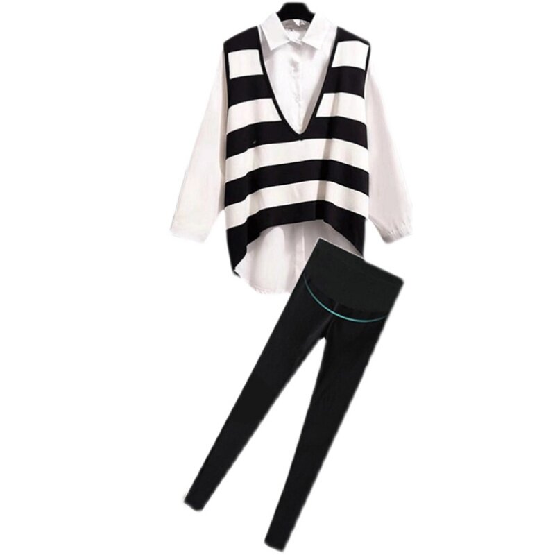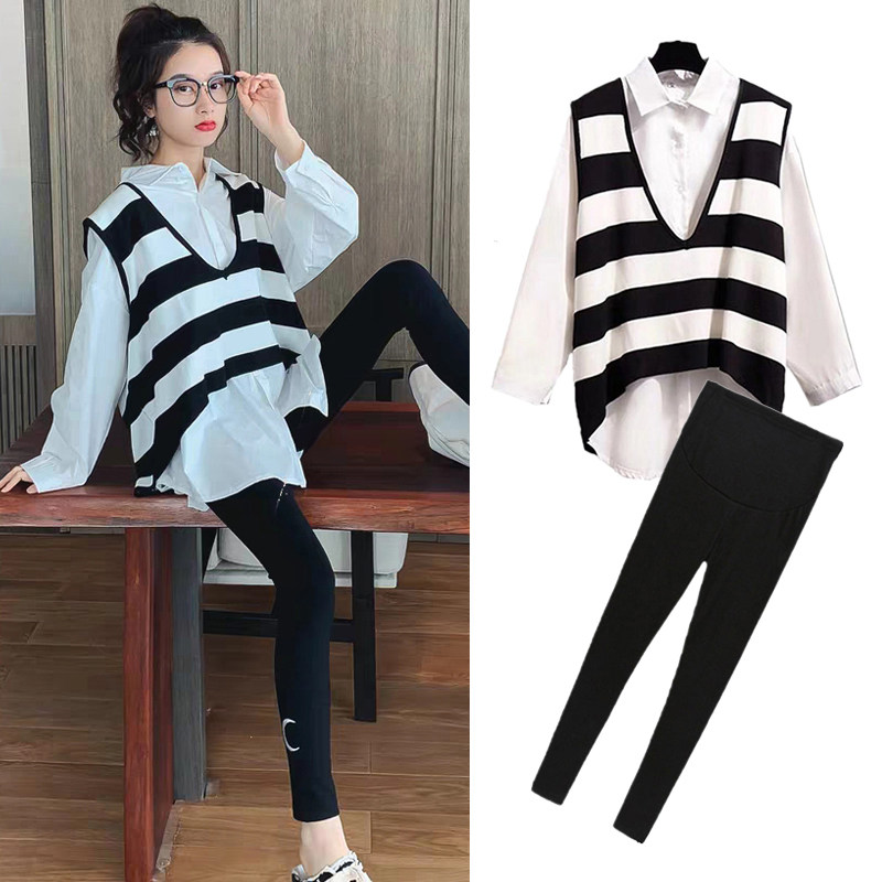 Online Red Pregnancy Maternity Dress Suit Spring Autumn Money Retro Fashion Out Spring Dress Shirt Striped Knit Vest Three Sets