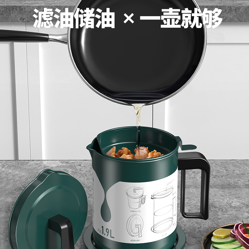 (ordinary section) 1 4L approbable 2 8 kilograms of oil leaving no residue to be sold only 14 9 (designer's section) Green 1 5L livable lid design anti-scalding handle Handle Strainer