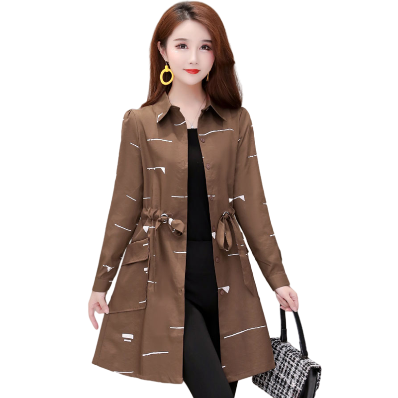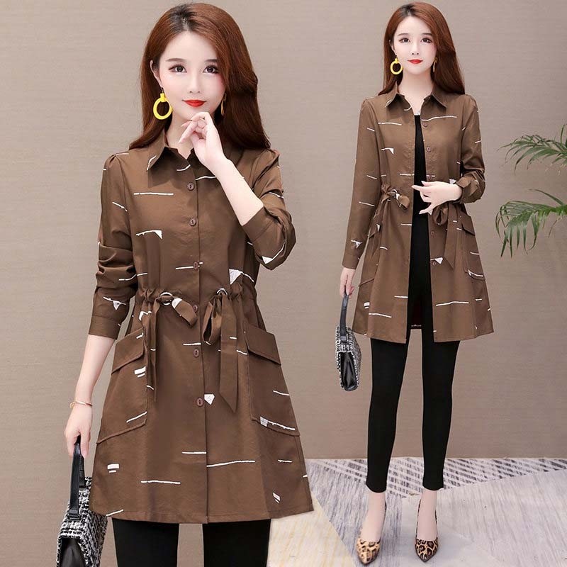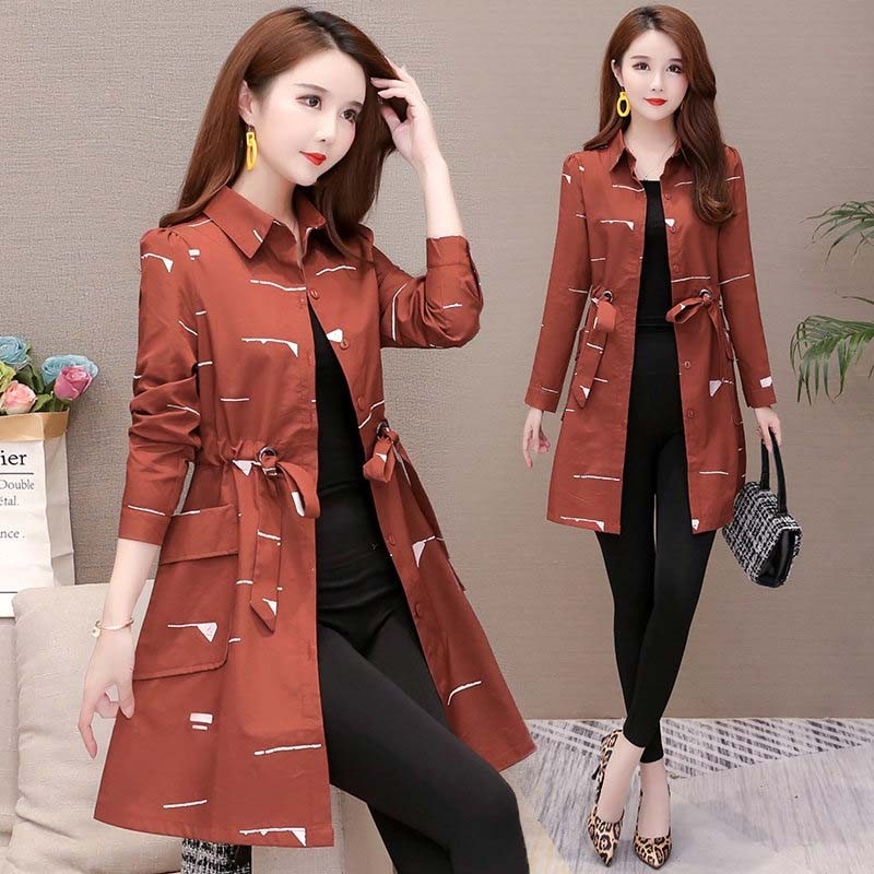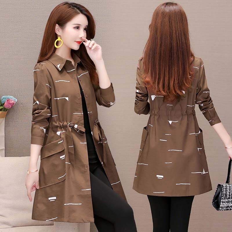 Wind coat woman medium long version 2022 Early spring new fashion small sub-temperament collection waist display slim print thin jacket