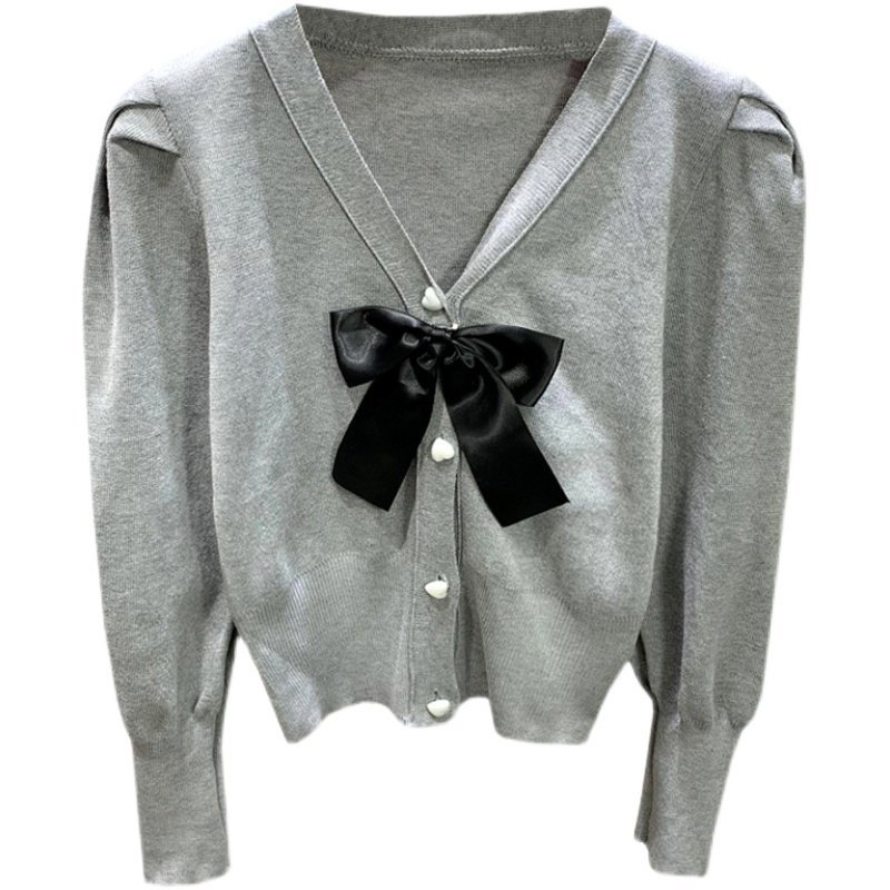 High-end gray sweater women's design sense niche V-neck bow top autumn and winter lazy style knitted cardigan jacket spring