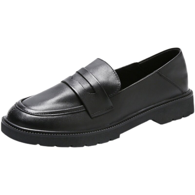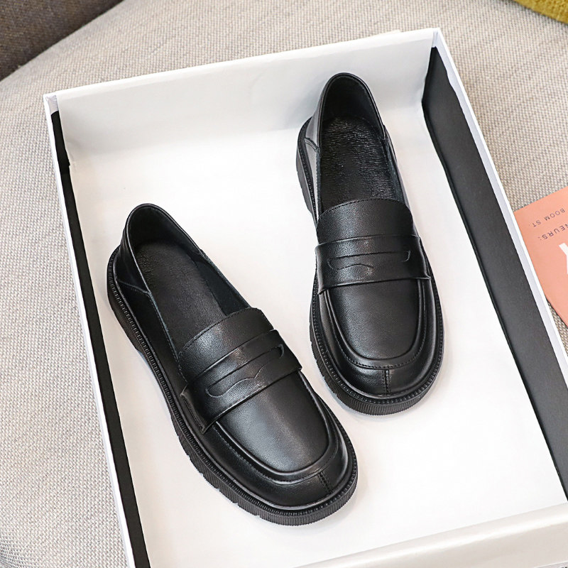 Inlen Wind Small Leather Shoes Day Ensemble Women Jk Soft Bottom Round Head Flat Bottom Black Single Shoes Gentle Worthy Dresses Genuine Leather Lefu Shoes