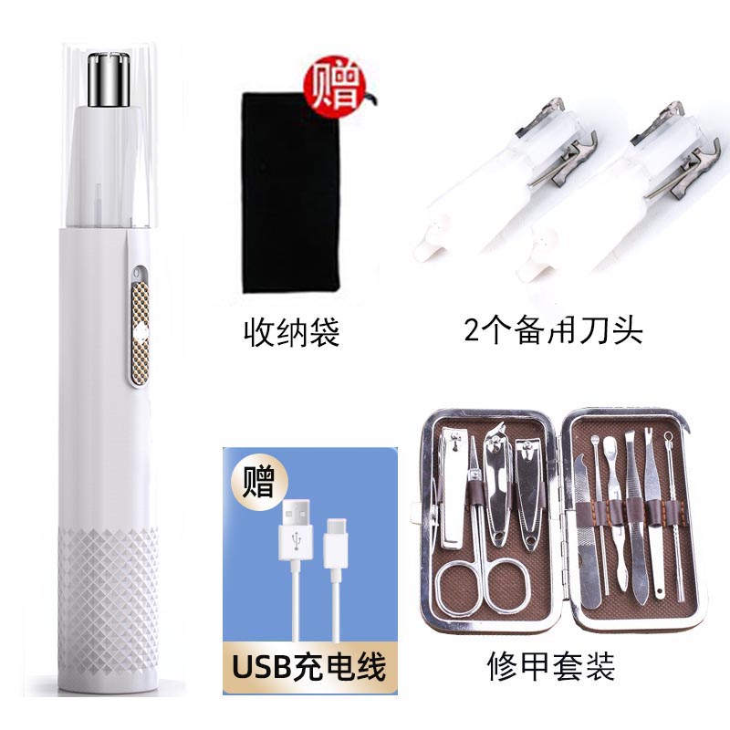 Blue plastic shell, golden metal shell, golden metal shell, 2 cutter heads, golden metal shell, 2 cutter heads, manicure, golden metal shell, razor head, golden metal shell, razor 2