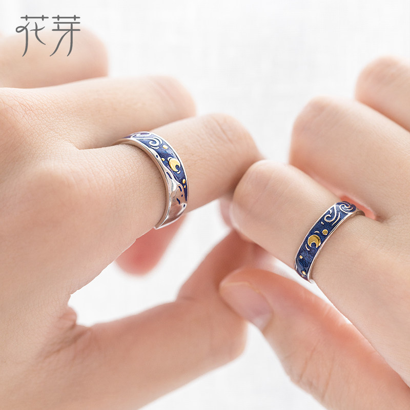 Flower Bud Van Gogh Starry Sky Original Ring Women's Sterling Silver Single Ring Niche Original Design Opening Adjustable Couple Ring