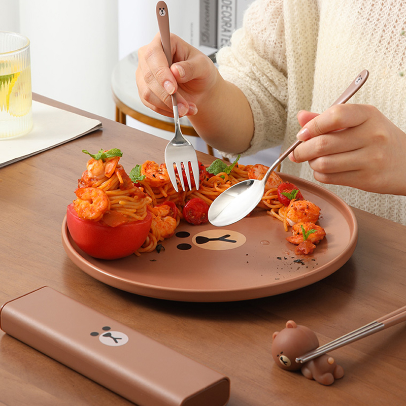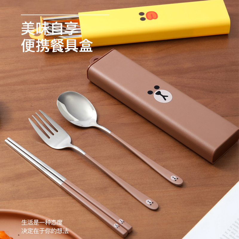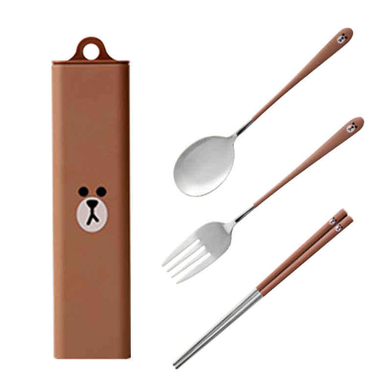 LINE Brown bear cartoon portable chopsticks spoon three-piece office worker student stainless steel tableware storage box