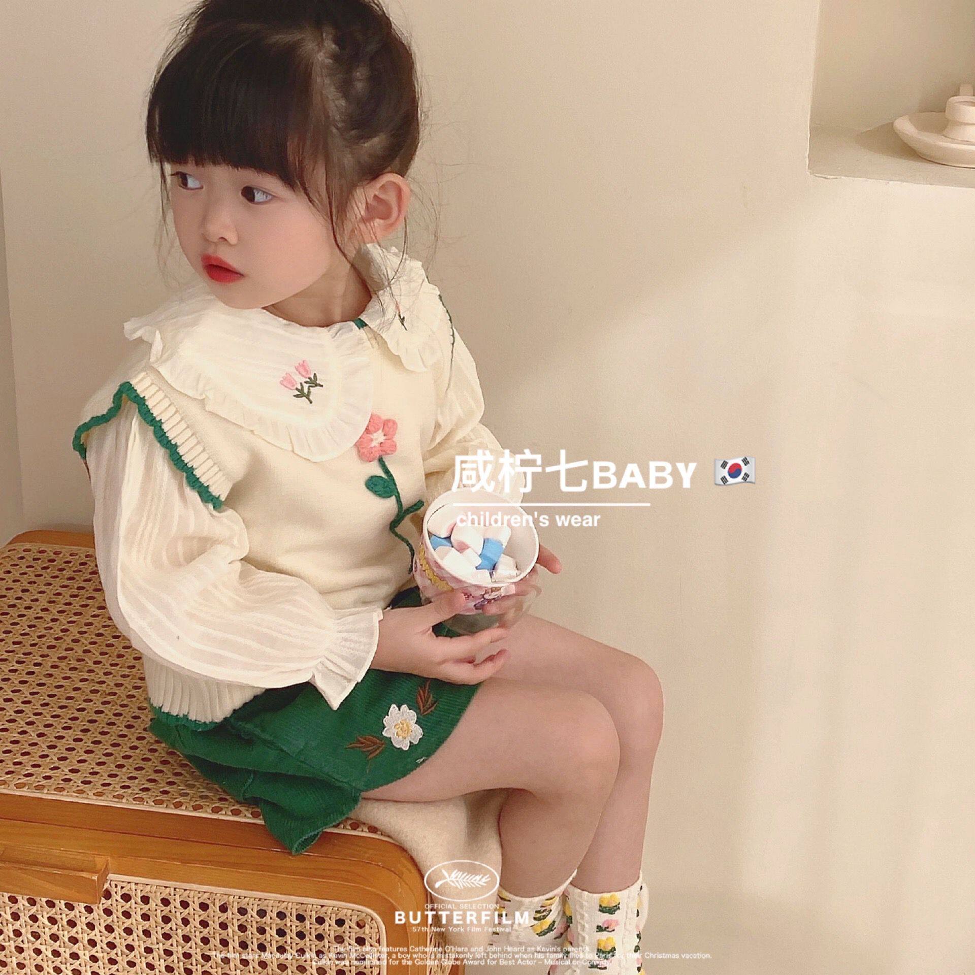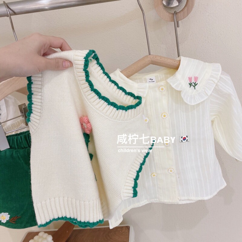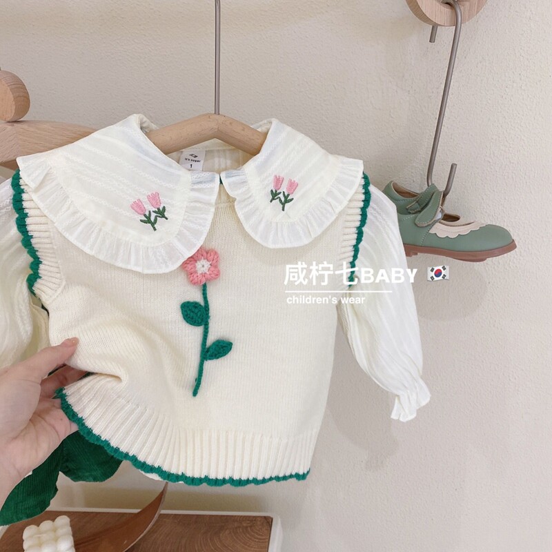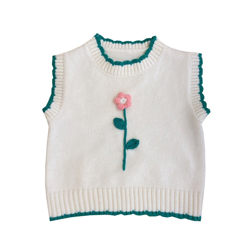 Children's flower sweater vest 2022 spring new girl baby round collar shoulder cover knitted waistcoat outside wearing