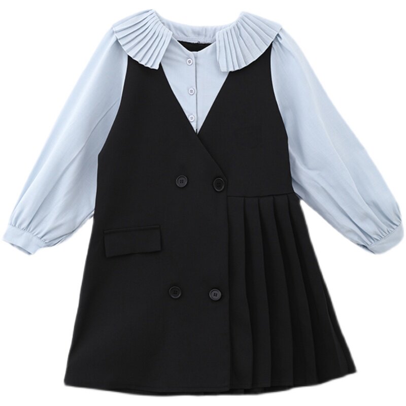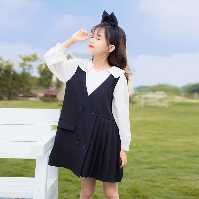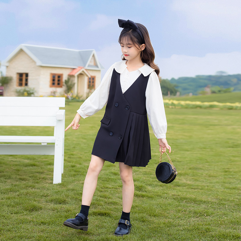 Girl's Spring Festival College Wind Dress 2022 Spring Dress New Foreign Pie Spring Autumn CUHK Child Children Fake Two Dresses