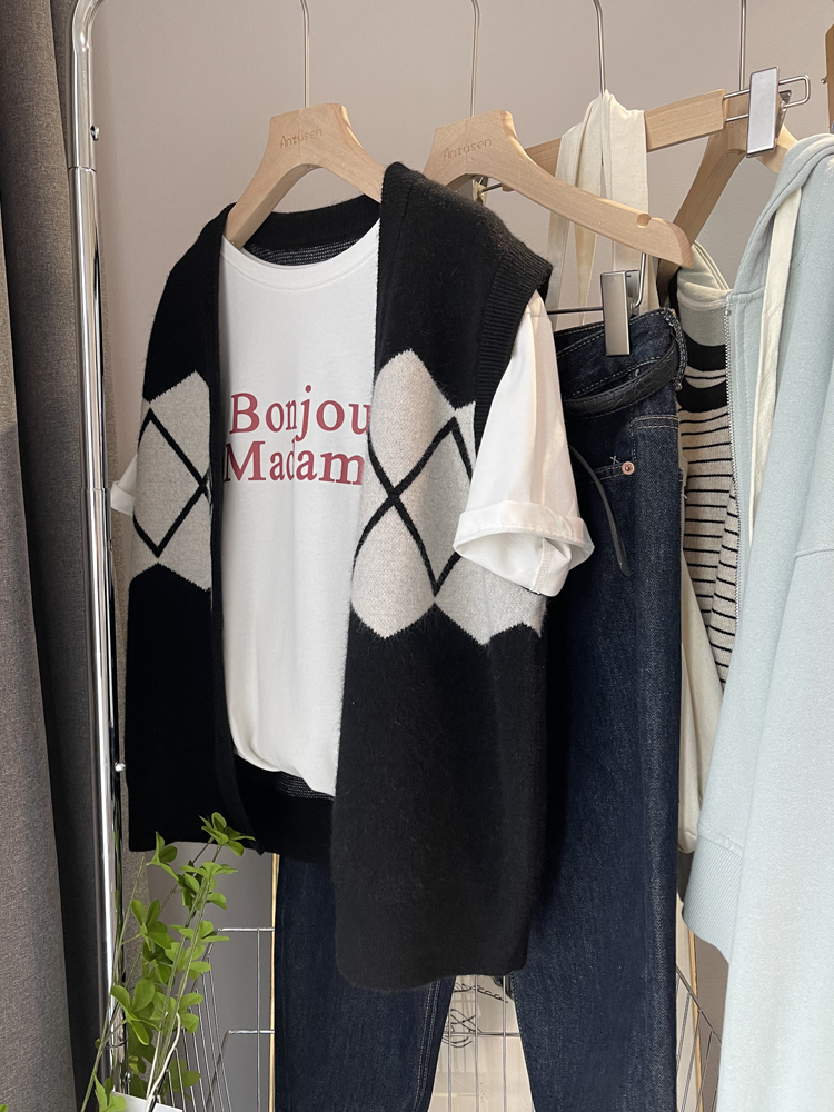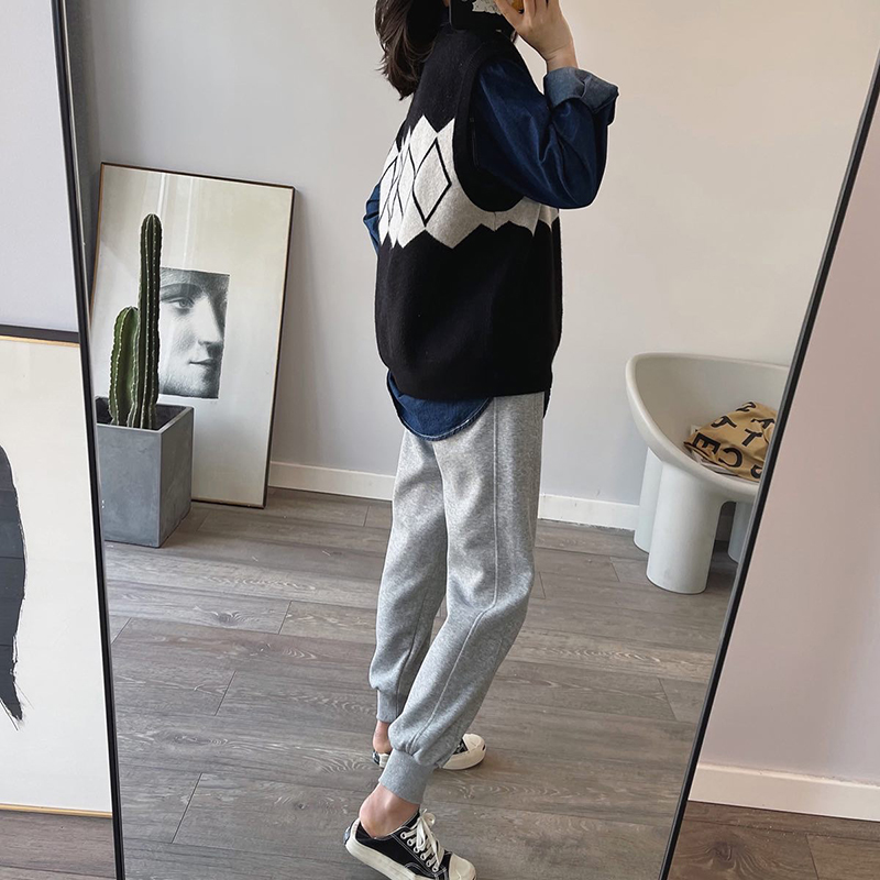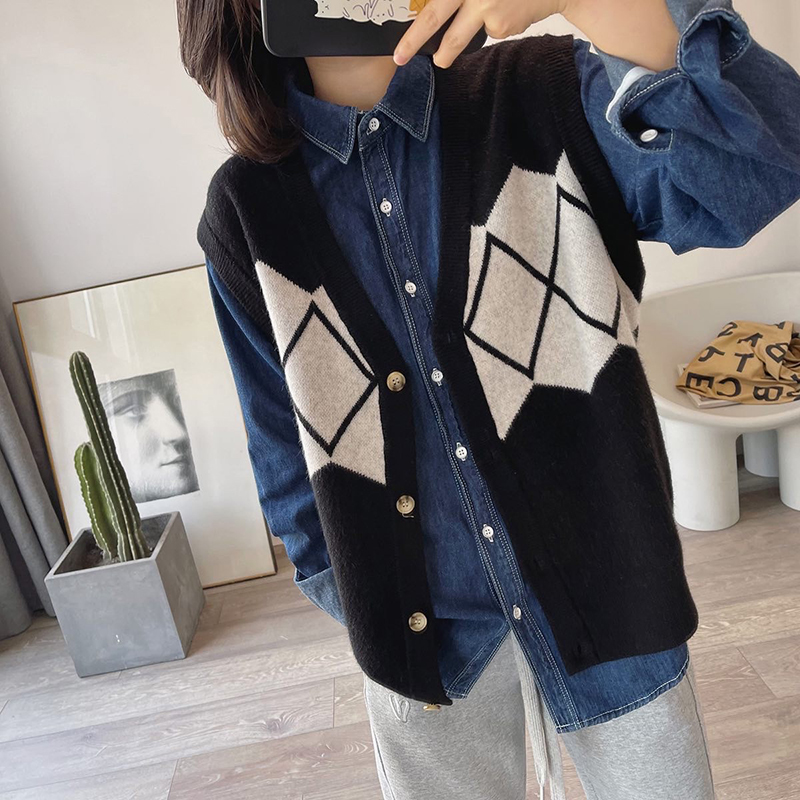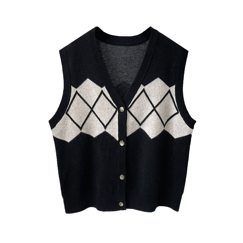 Autumn new products simple contrasting color diamond knitted vest women's Korean version V-neck folded waistcoat design sweater vest