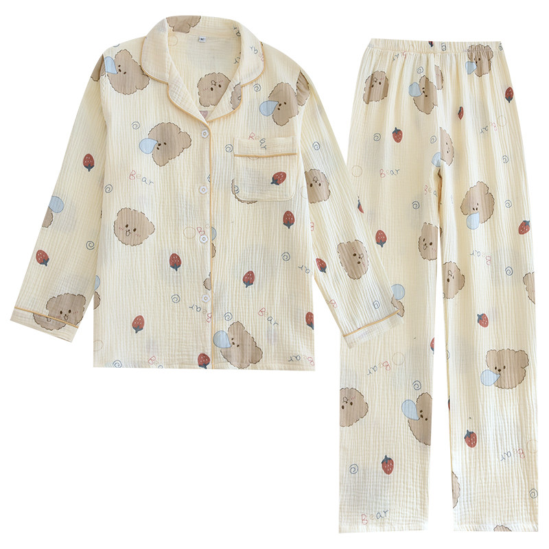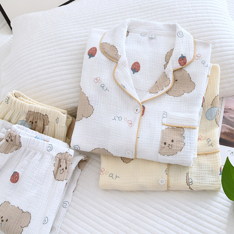 Sleepwear Spring And Autumn Section Woman Pure Cotton Double Layer Gauze Long Sleeve Long Pants Suit Large Size Code Full Cotton Exterior Wear New Home Clothing