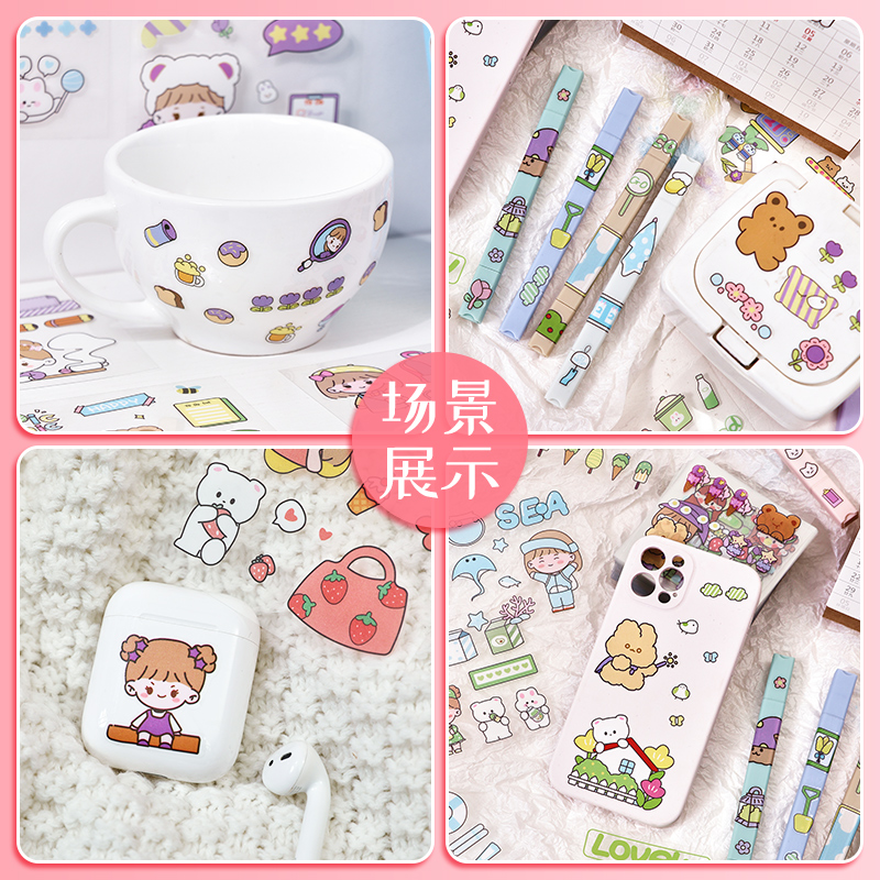 Handbook Sticker 100 Sheet Set Water Cup Decoration Small Pattern Cartoon Sticker Transparent Traceless Waterproof Thermos Cup Kettle Cute Children Girl Girl Heart Day Ins Wind Cane