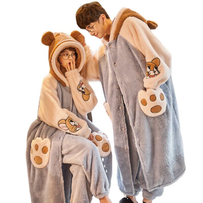 Couple Pajamas Women Autumn and Winter Coral Fleece Men's Thickened Plush Long Nightgown Flannel Warm Bathrobe Set