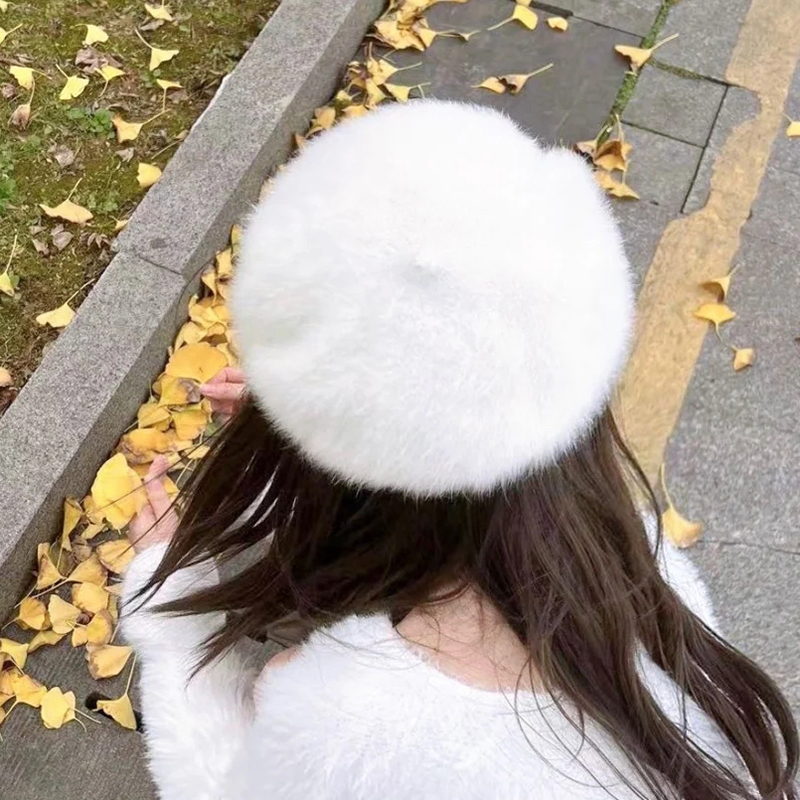Cute white rabbit furry plush beret women's autumn and winter Zhou Youlin's same small Japanese painter hat - Taobao