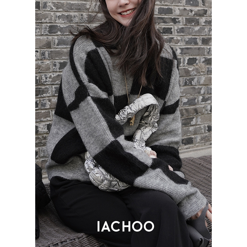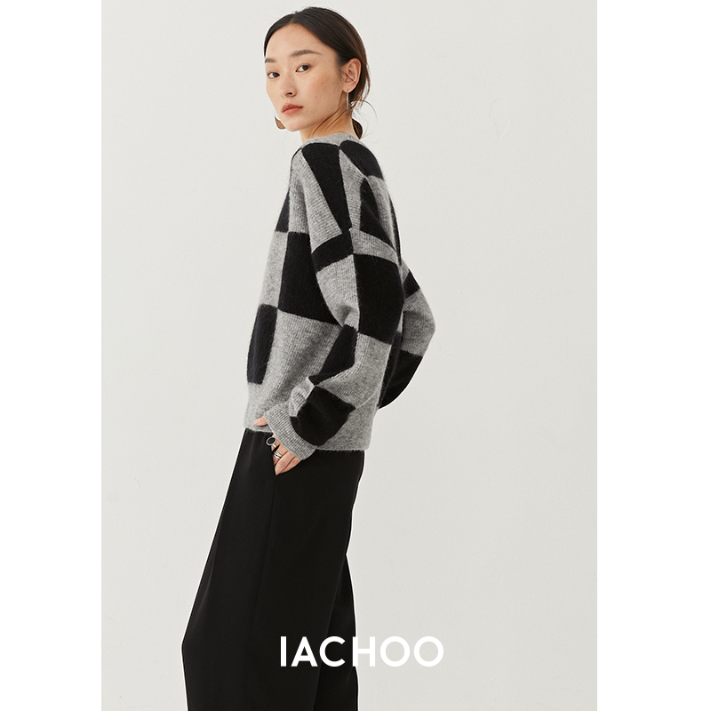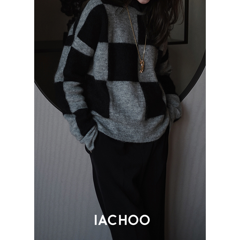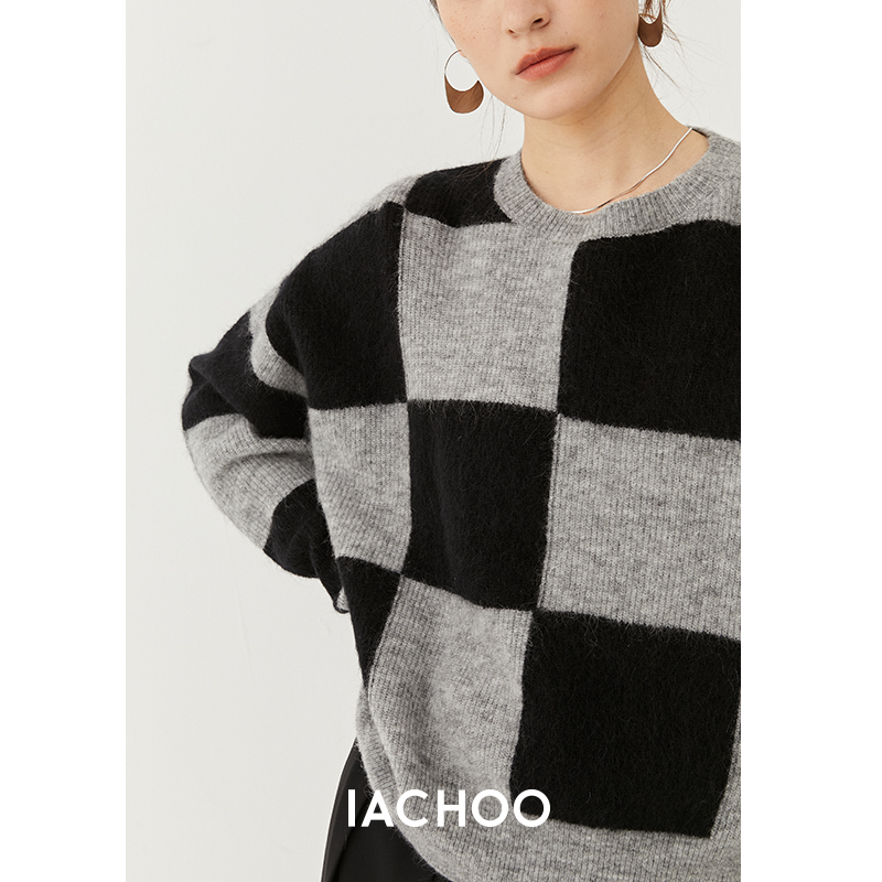 IACHOO 2022 spring new checkerboard mohair wool pullover loose design sweater minimalist