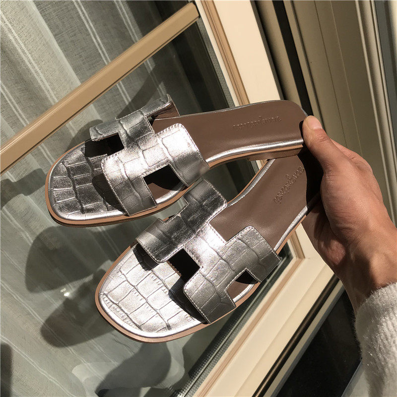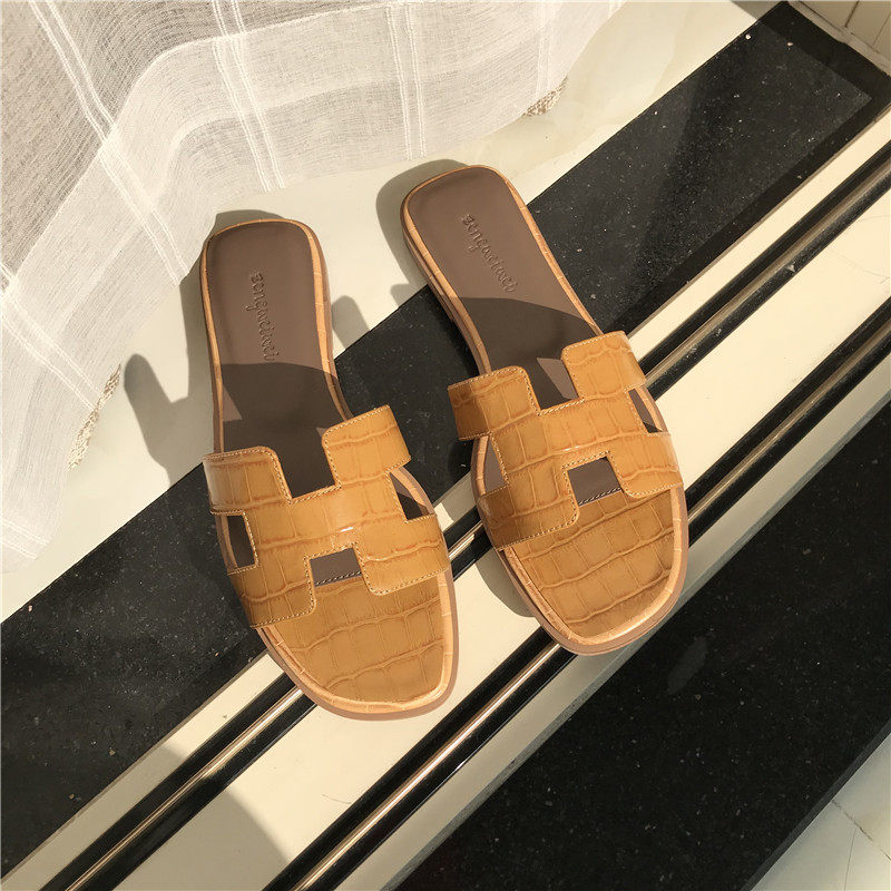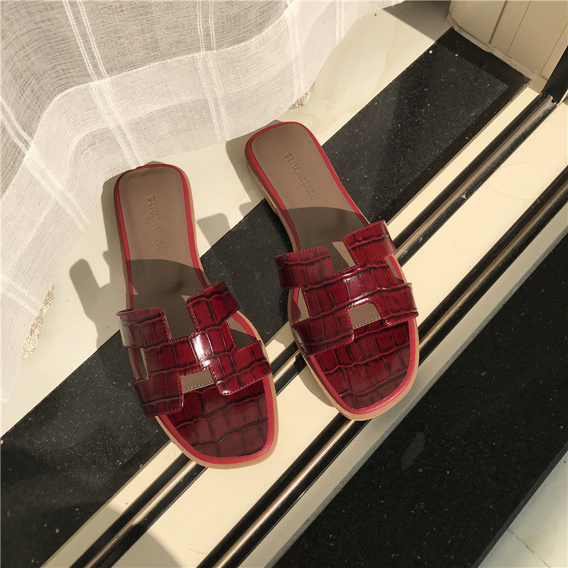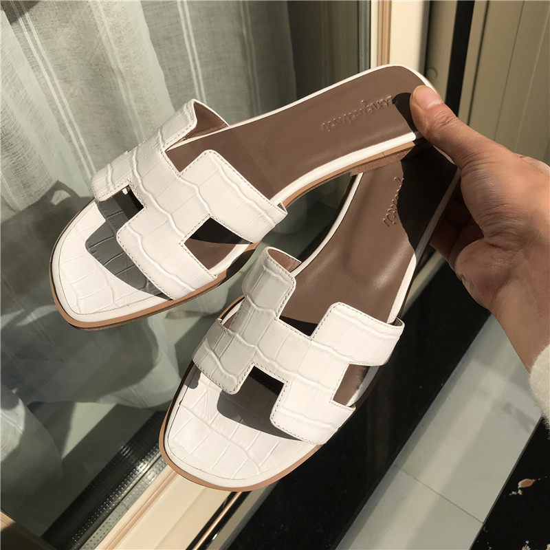 Slippers female outside wearing 2022 Summer new 100 lap net red genuine leather beach lined with flat crocodile tattooed sandals