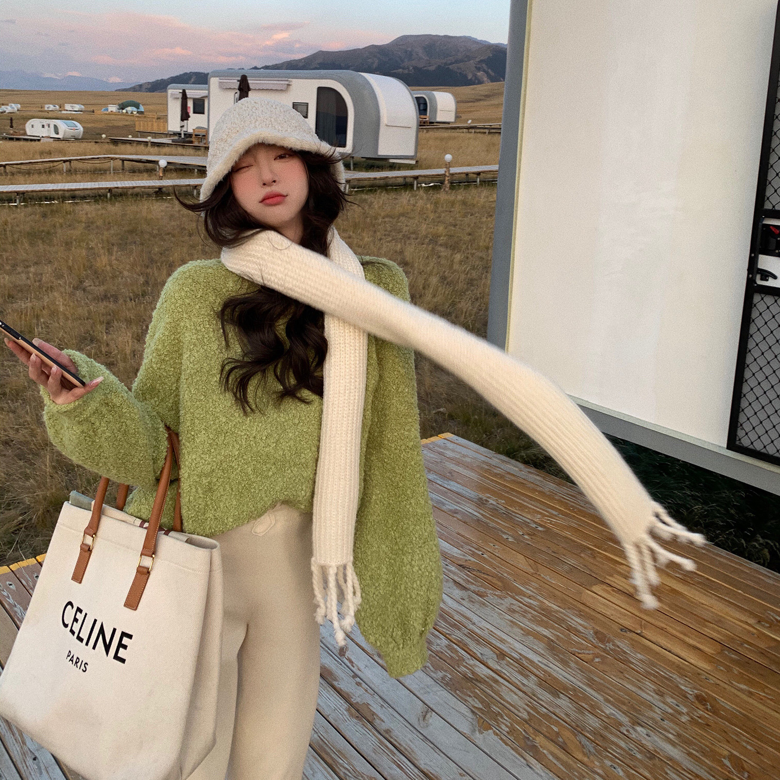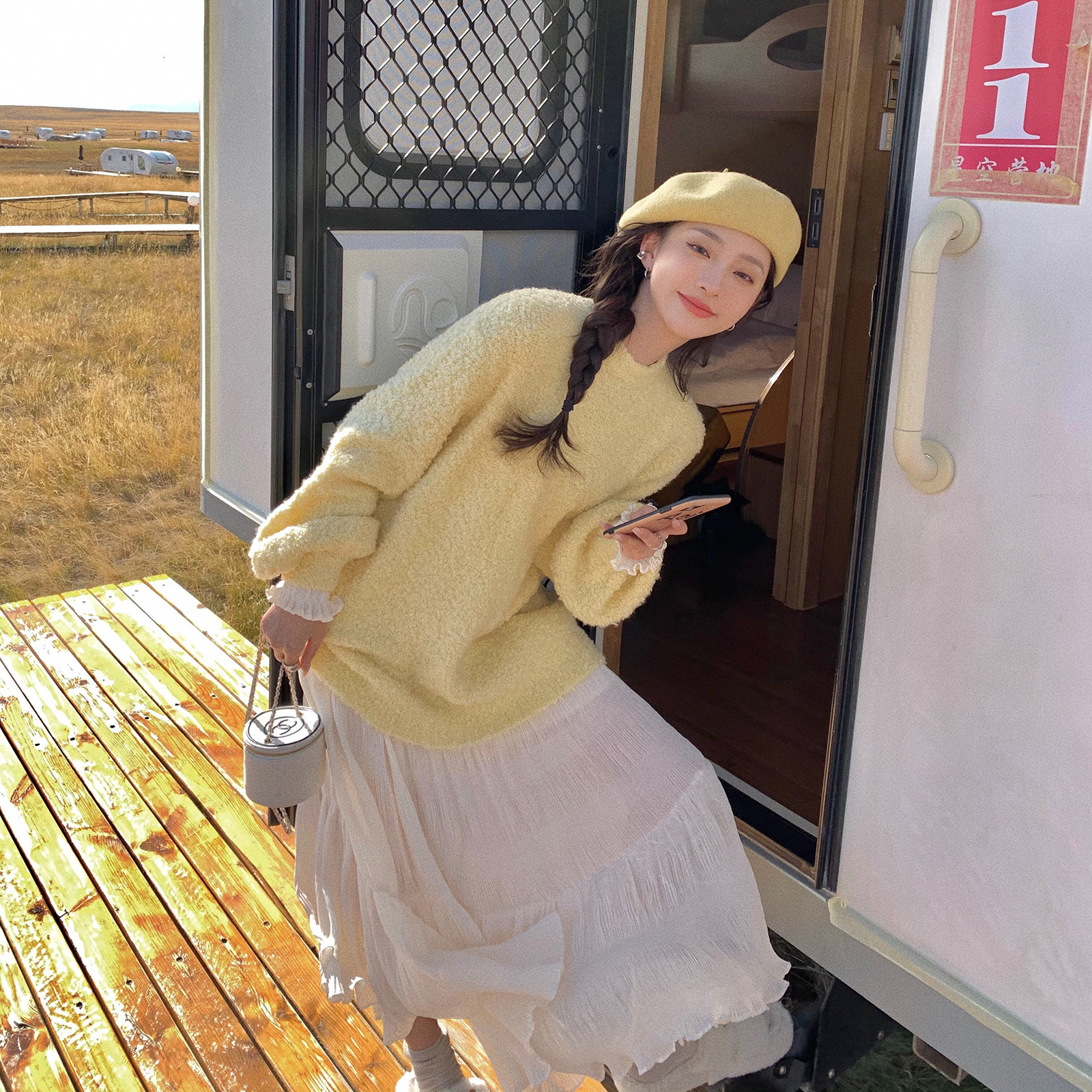 The soft color of the "puff sweater" stepping on the clouds is so good
