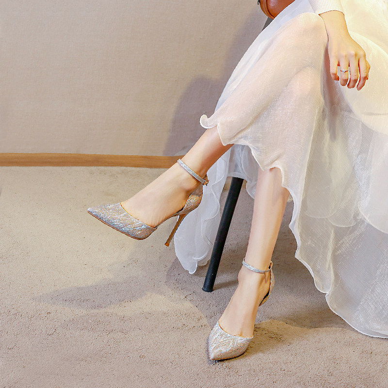 Small heels in 2022 new French tip shoes in the slippery crystal shoes wedding shoes