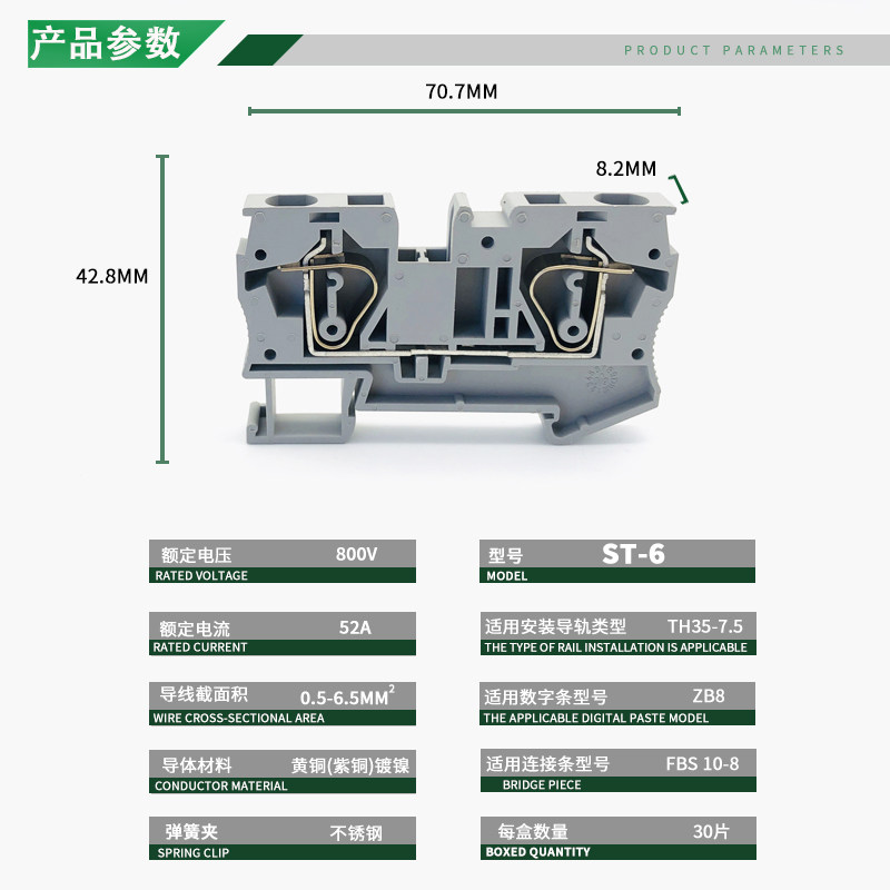 ST-6 track terminal 6 square 52A high current spring self-locking quick wiring 30 pieces of pure copper parts