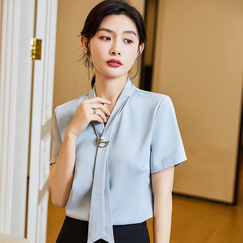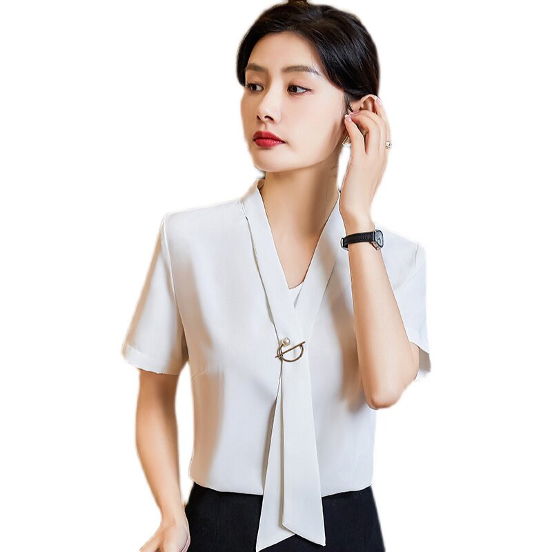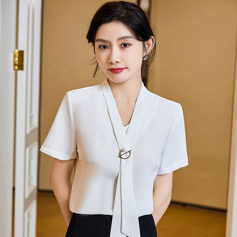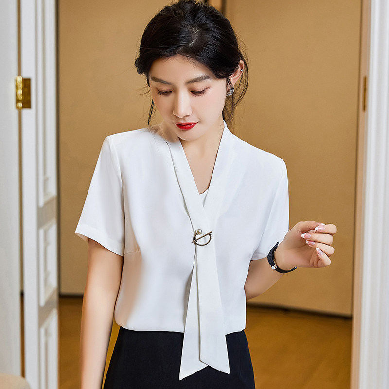 Short sleeve pure color v-collar shirt thin white ol shirt professional clothing teacher interview white collar work clothing summer