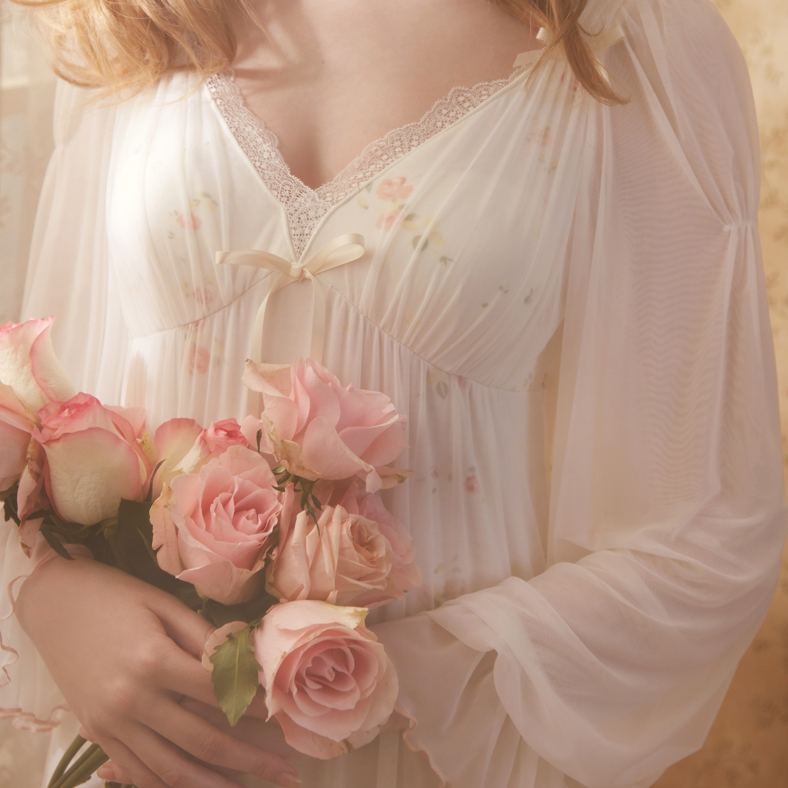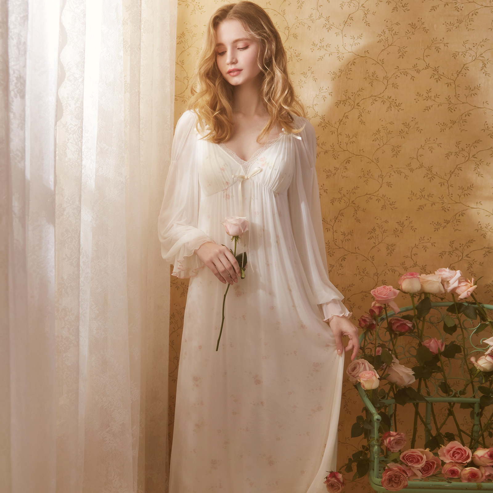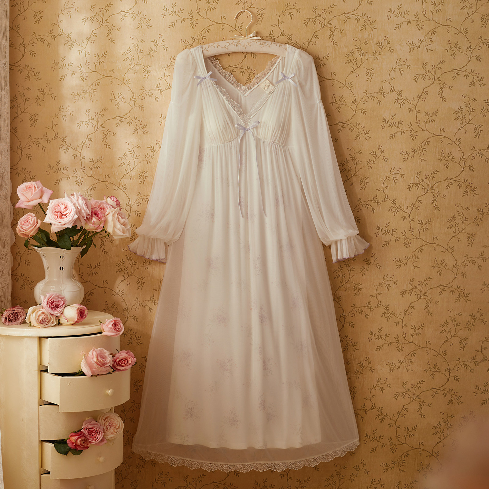 RoseTree Princess Wind Sleeping Dress Lady Spring Autumn Long Sleeve Thin Lace Sweet sexual sensation with chest cushion Sleepwear long version