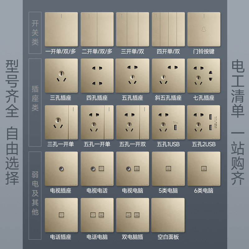 Five-hole socket Oblique five-hole socket One open single control One open double control One open multi-control Two open single control Two open double control Two open multi-control Three open single control Three open double control Four open single control Four open double control