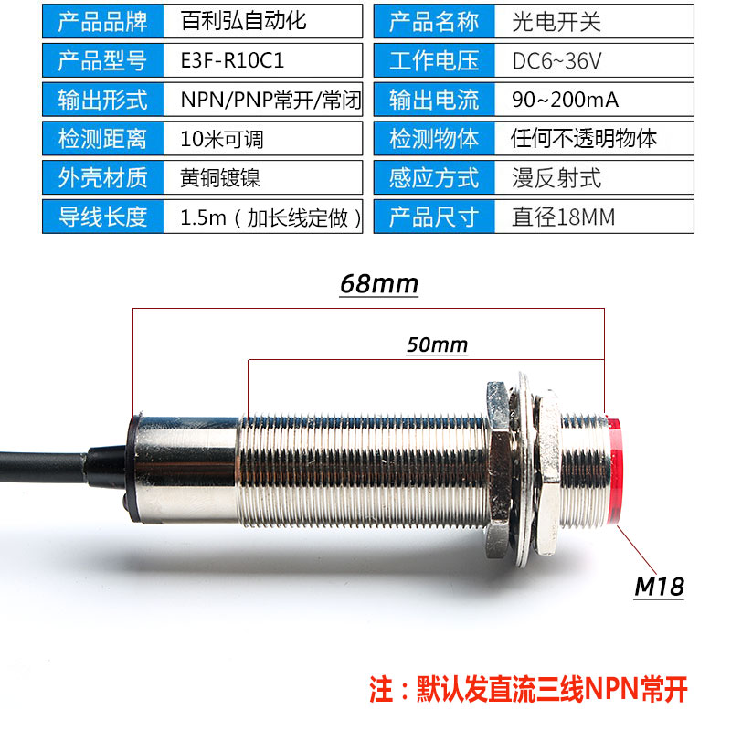 Laser feedback reflected light electric switch M18 long distance 10m adjustable visible light third-line NPN infrared sensor