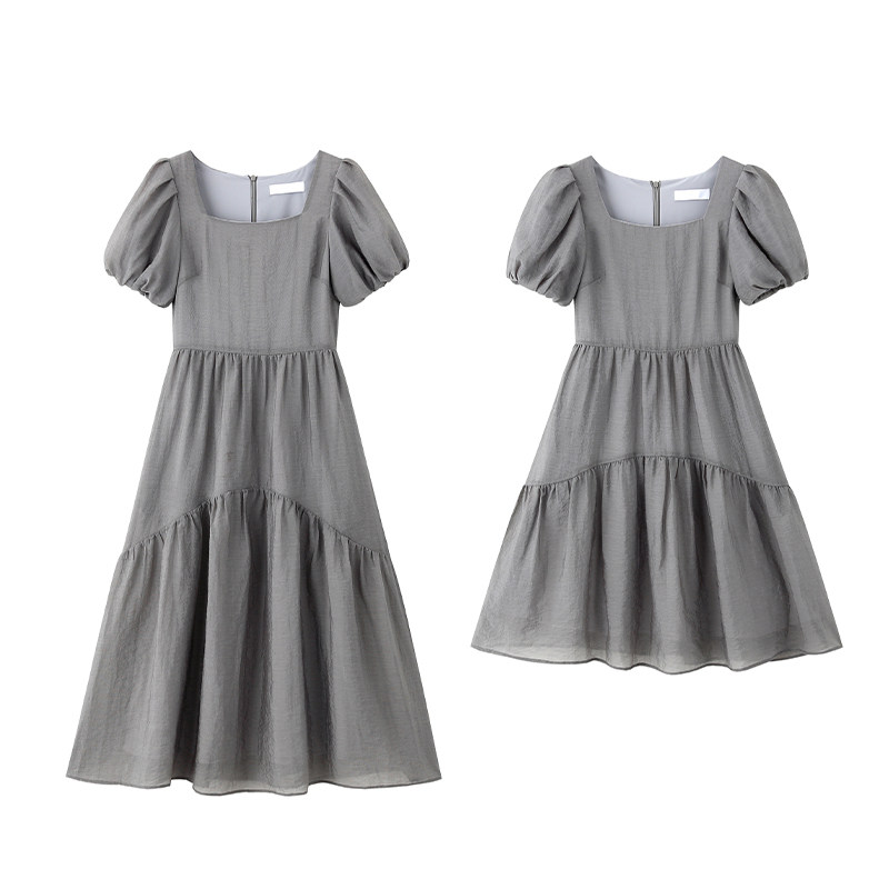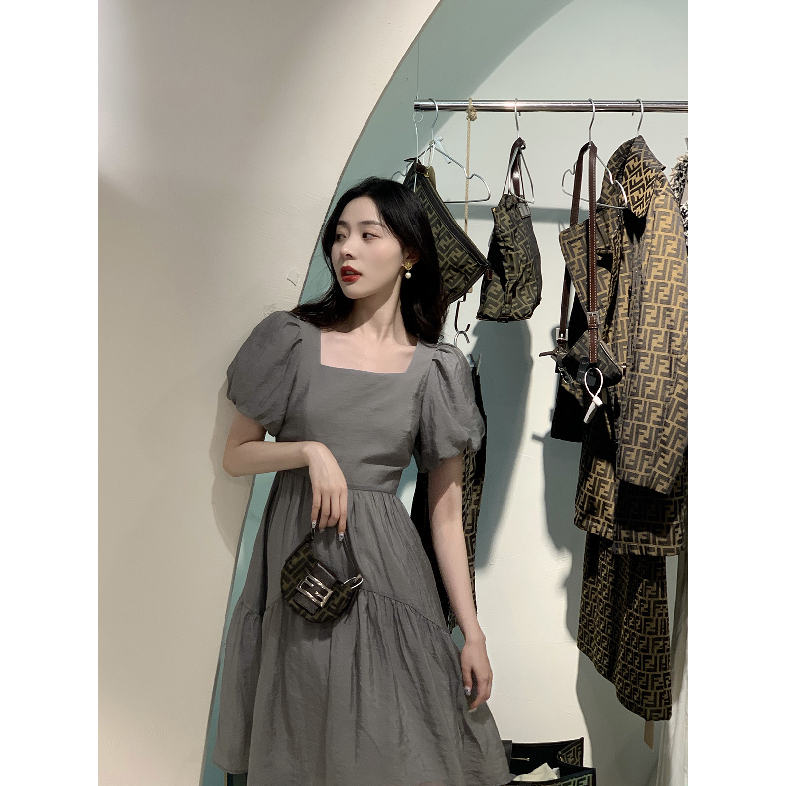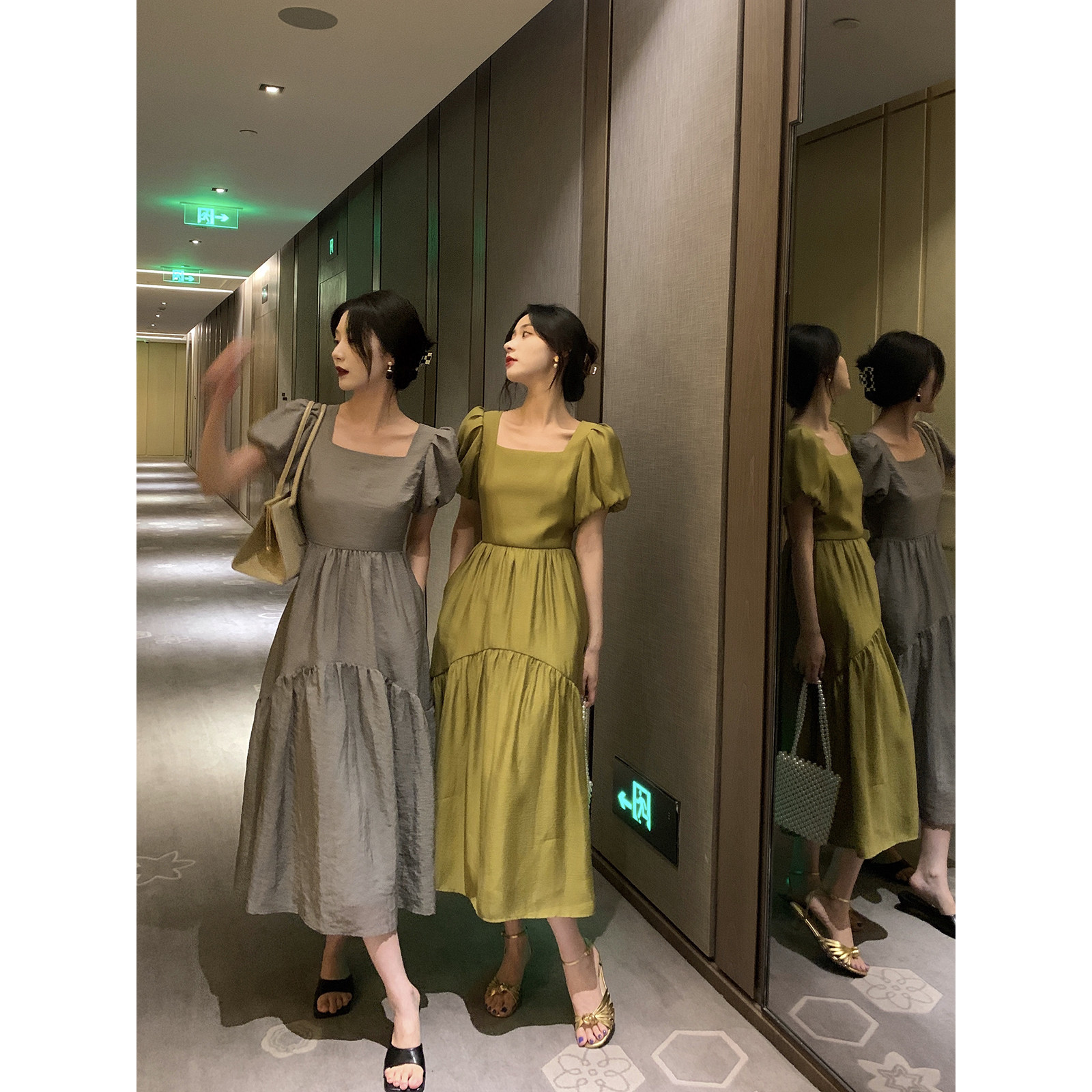 Egret Green One Mousse Teenage Girl Grey Ocean Dress Summer Women's Style Retro Square Led Bubble cuff close-length dress