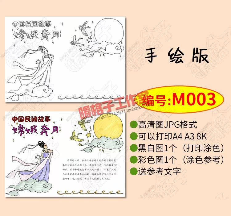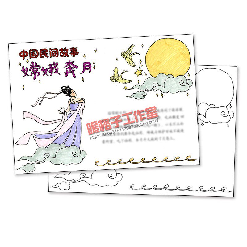 Primary school students Chang'e flying to the moon hand-painted illustration template Chinese folk tales and legends hand-written newspaper coloring electronic version