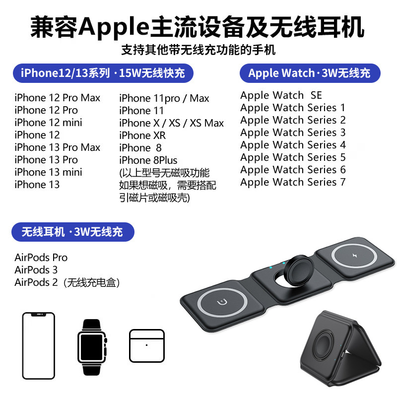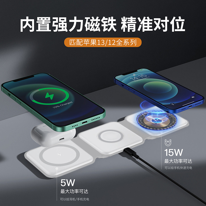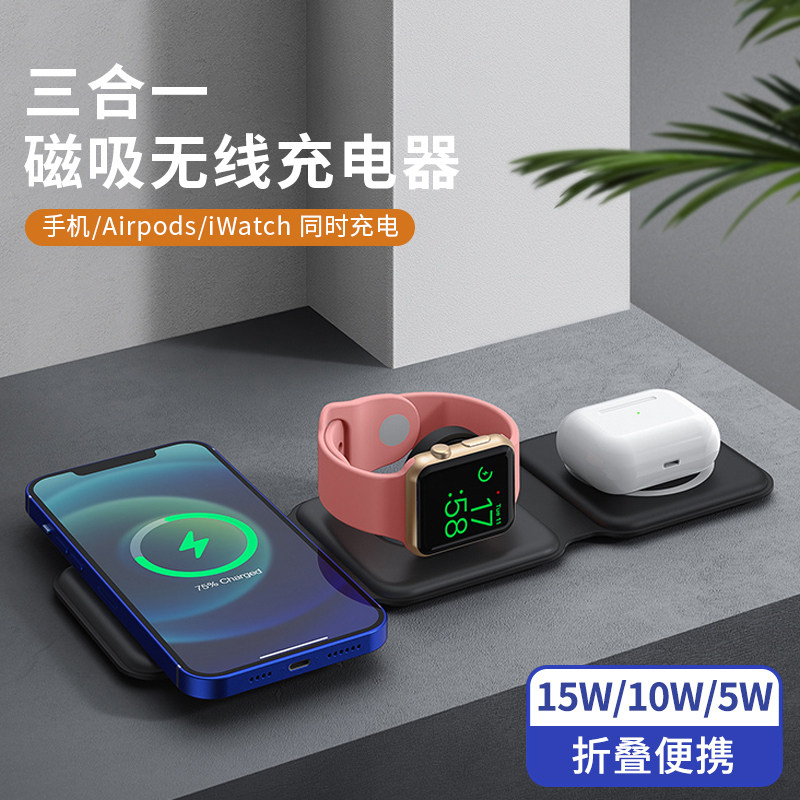 Three-in-one wireless charger magsafe folding magnetic suction 15W fast charge 13 is suitable for 14 Apple iPhone 13 mobile phone iWatch watch AirPods headset