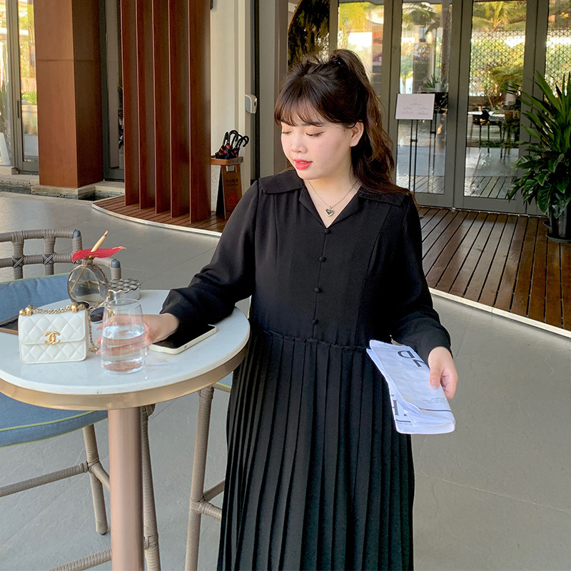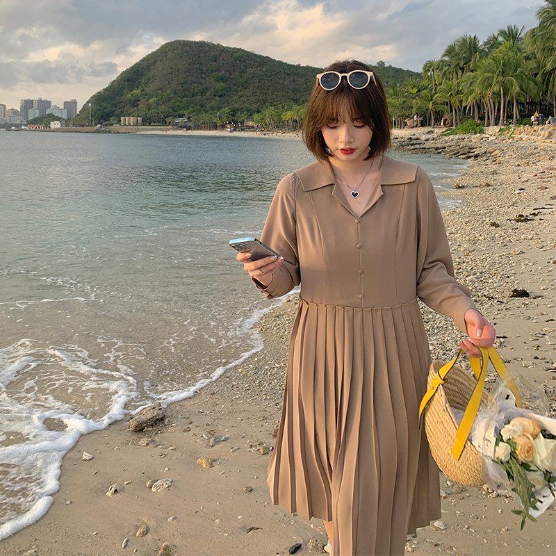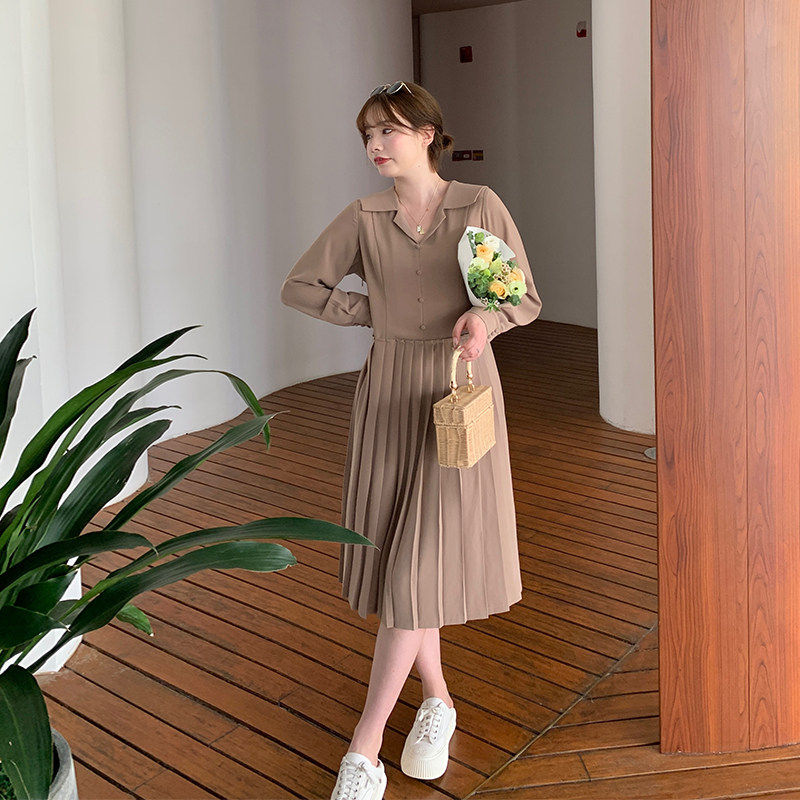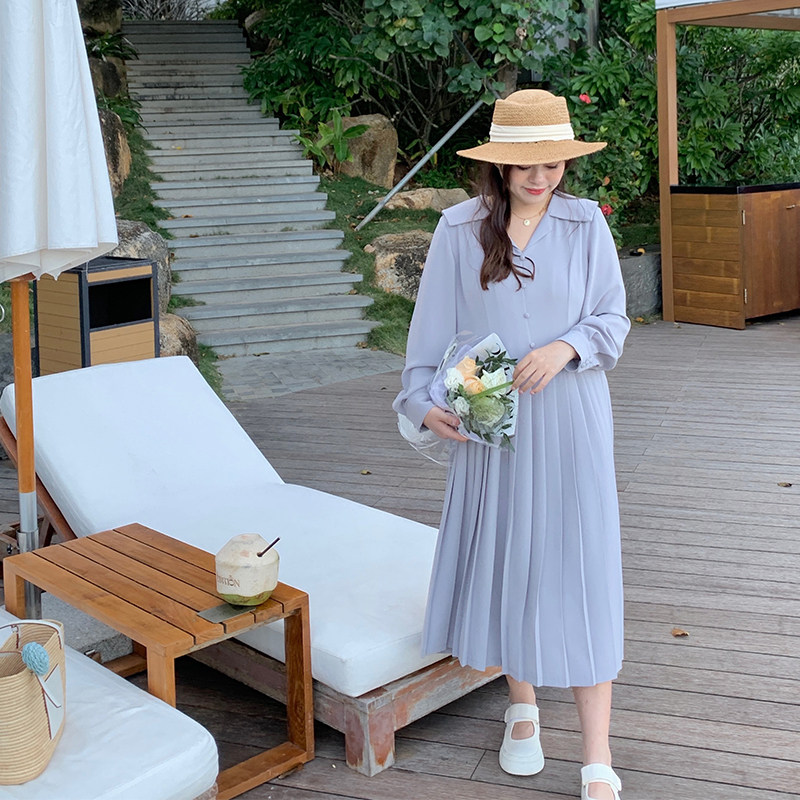 (Spotting to give back six fold snapped snout) Microfat mm Navy collar 100 pleats dress Dress Woman Loose slim shirt dress