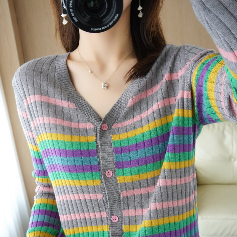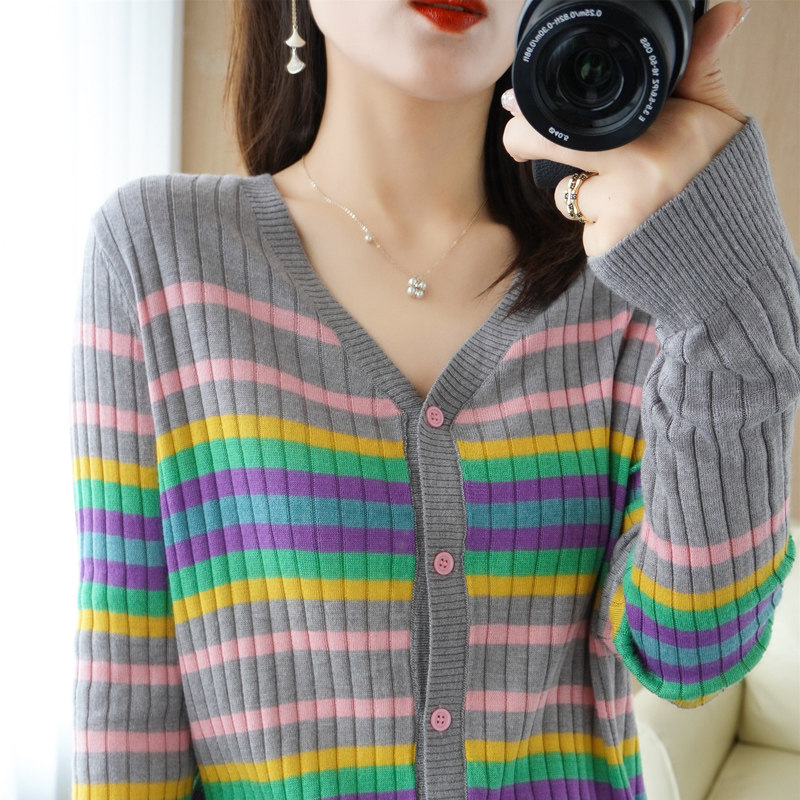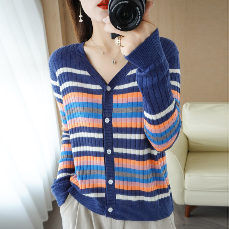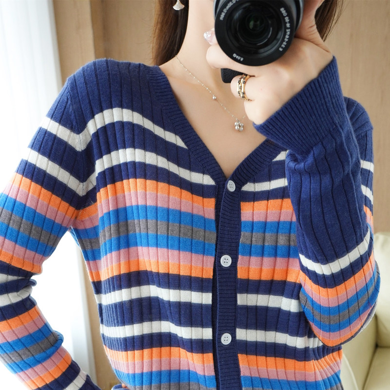 New Outer Wool Knit Cardigan Ladies V-Neck Long-Sleeve Striped Bottom Slim Fit Non-Cashmere Thin Jacket