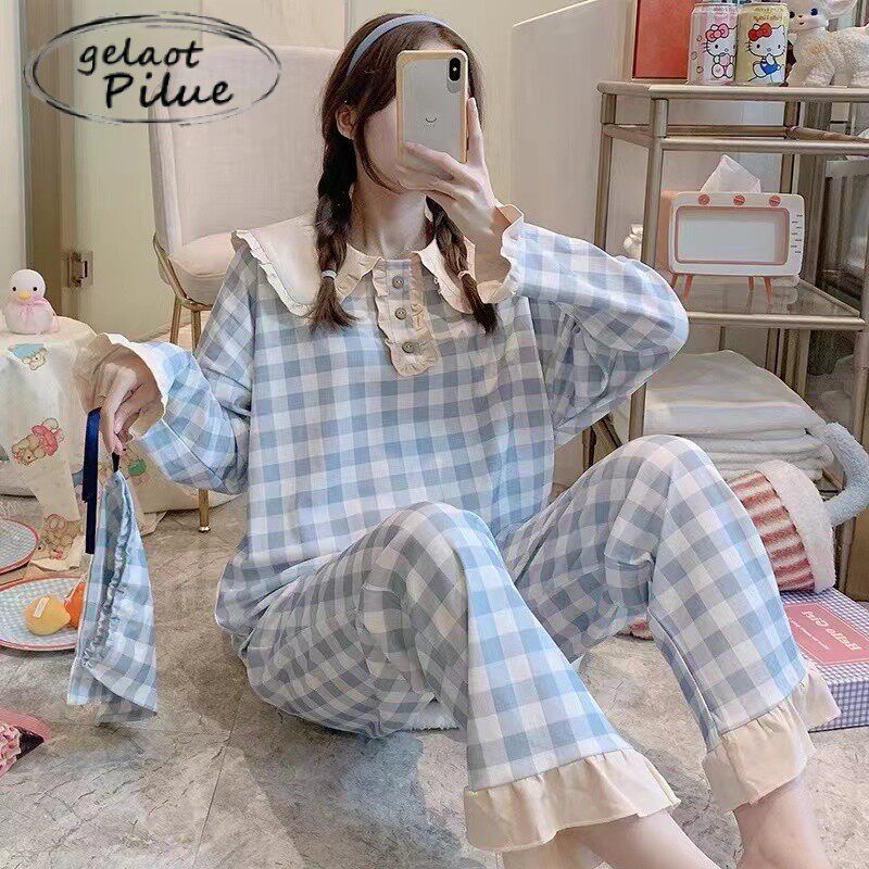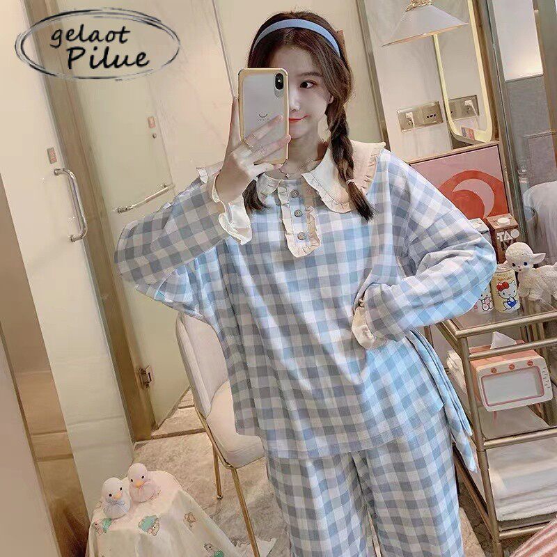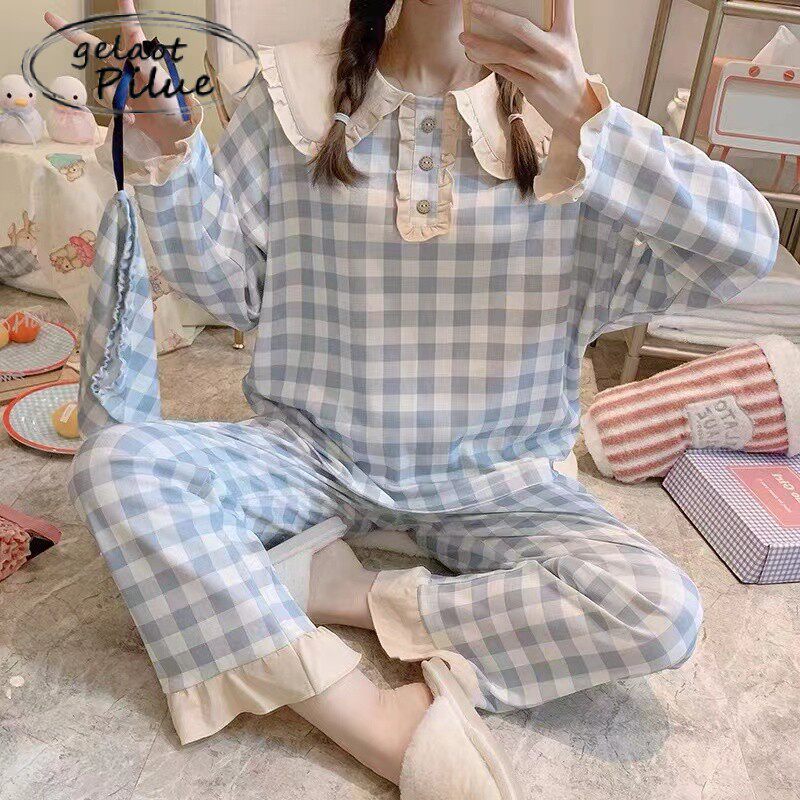 Japanese GP plaid simple net red popular pajamas women's long-sleeved spring and autumn small fresh outer wear home clothes suit