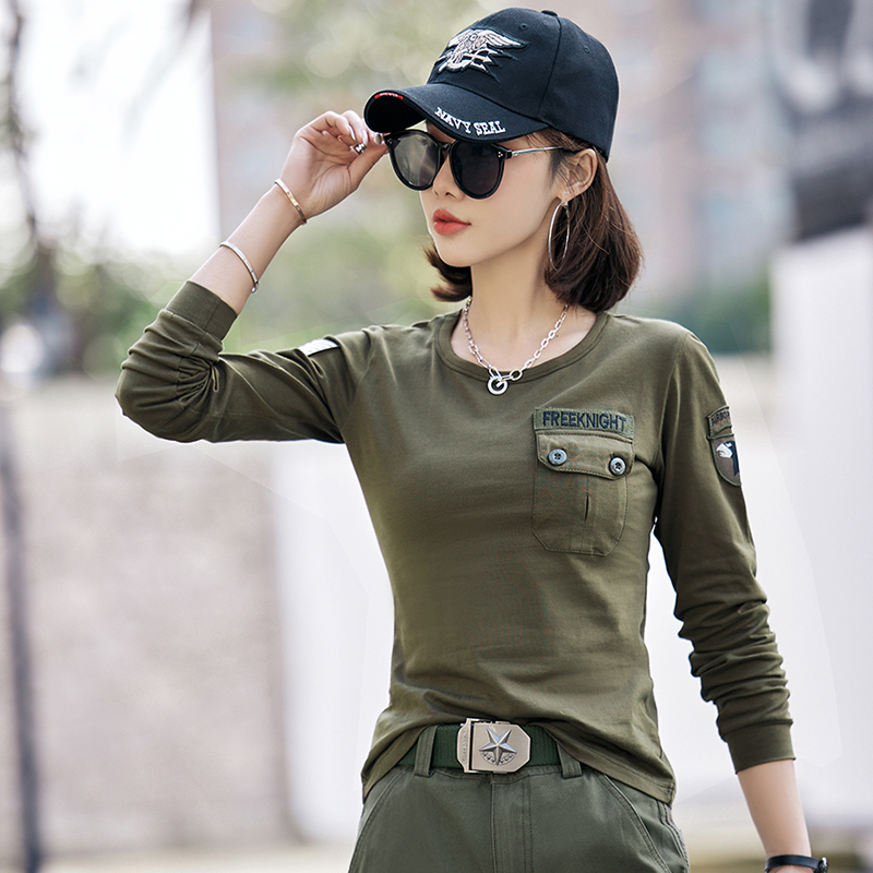 Spring and autumn new camouflage T-shirt women's long-sleeved tooling loose new trendy fashion elastic thin sailor dance top