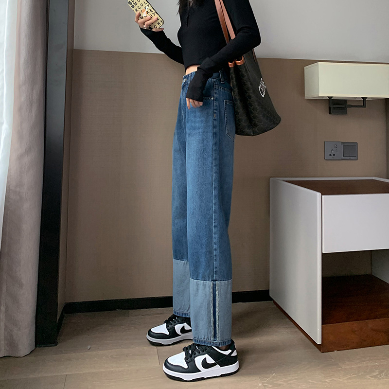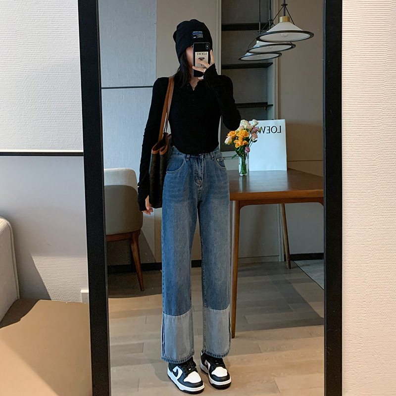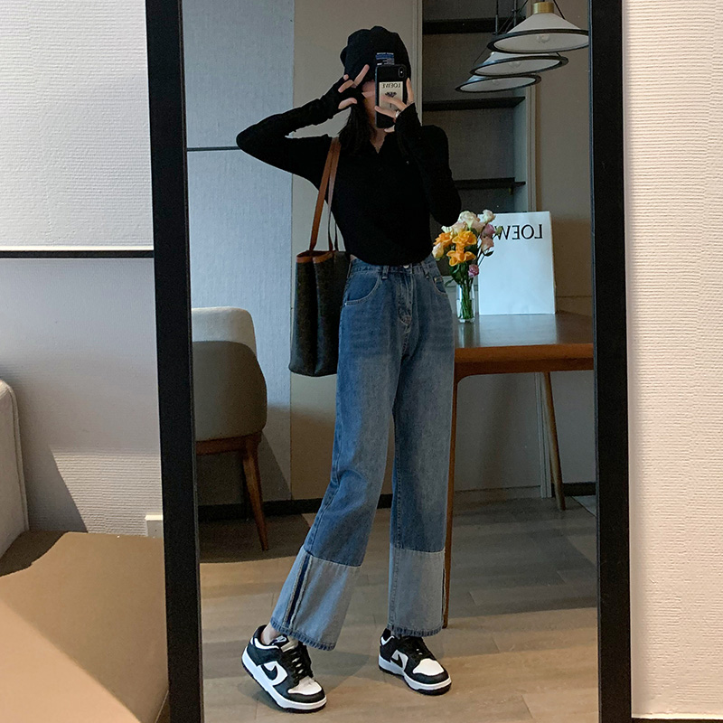 Jeans Female Boomers Loose straight drum Broadleg Splicing Curl 2022 New Design Sense Little Crowdpants Spring Autumn