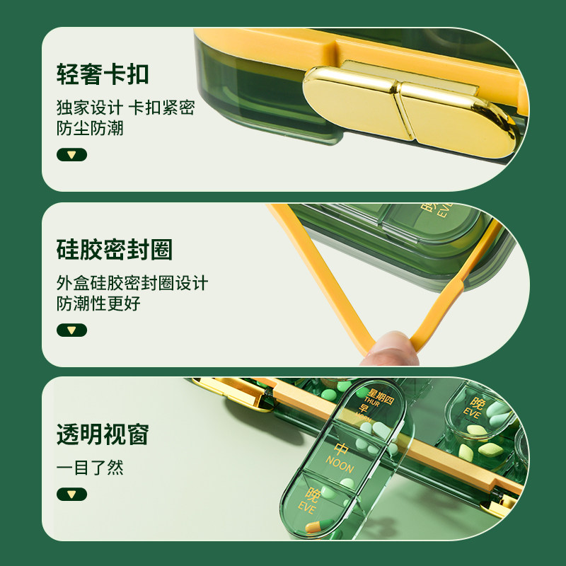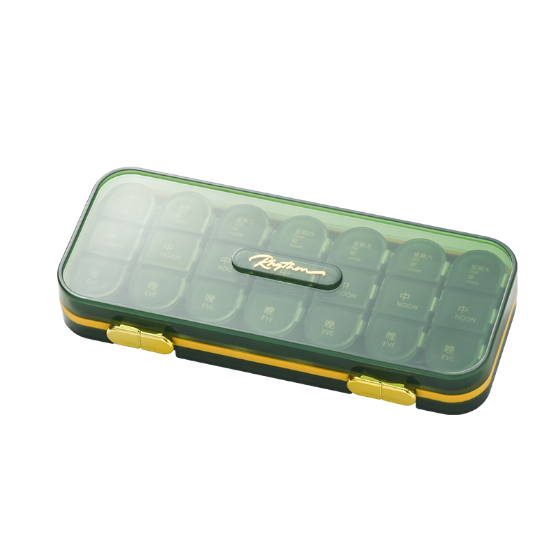 Sub-medicine boxes ● 7 days early and late reminder ● Elderly medicine no longer sentimental (21 points for 7 days) ● Transparent green ● Food grade (21 points for 7 days) ● Transparency black ● Food grade (