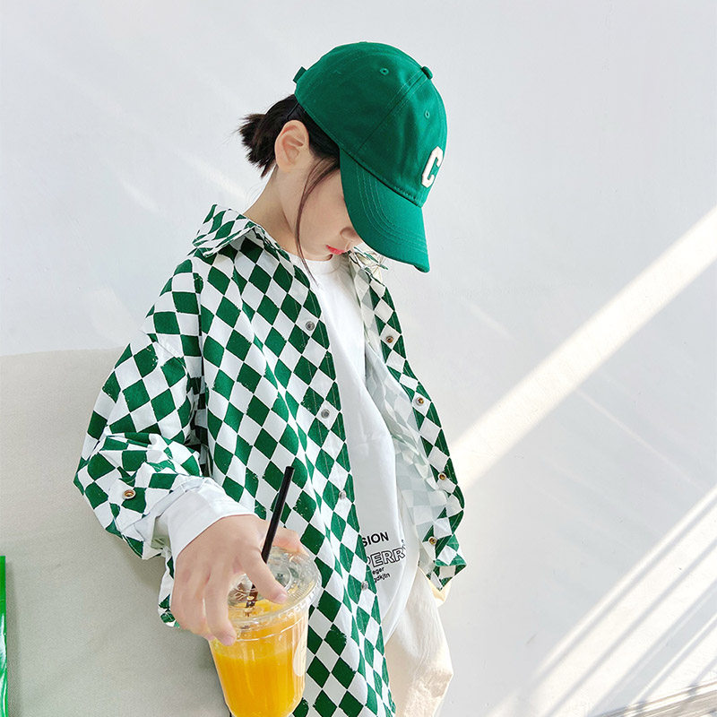 Girl Shirt Jacket 2022 New Spring Dress Children Plaid Tide Card Jacket Capsized Boy Han Edition Shirt