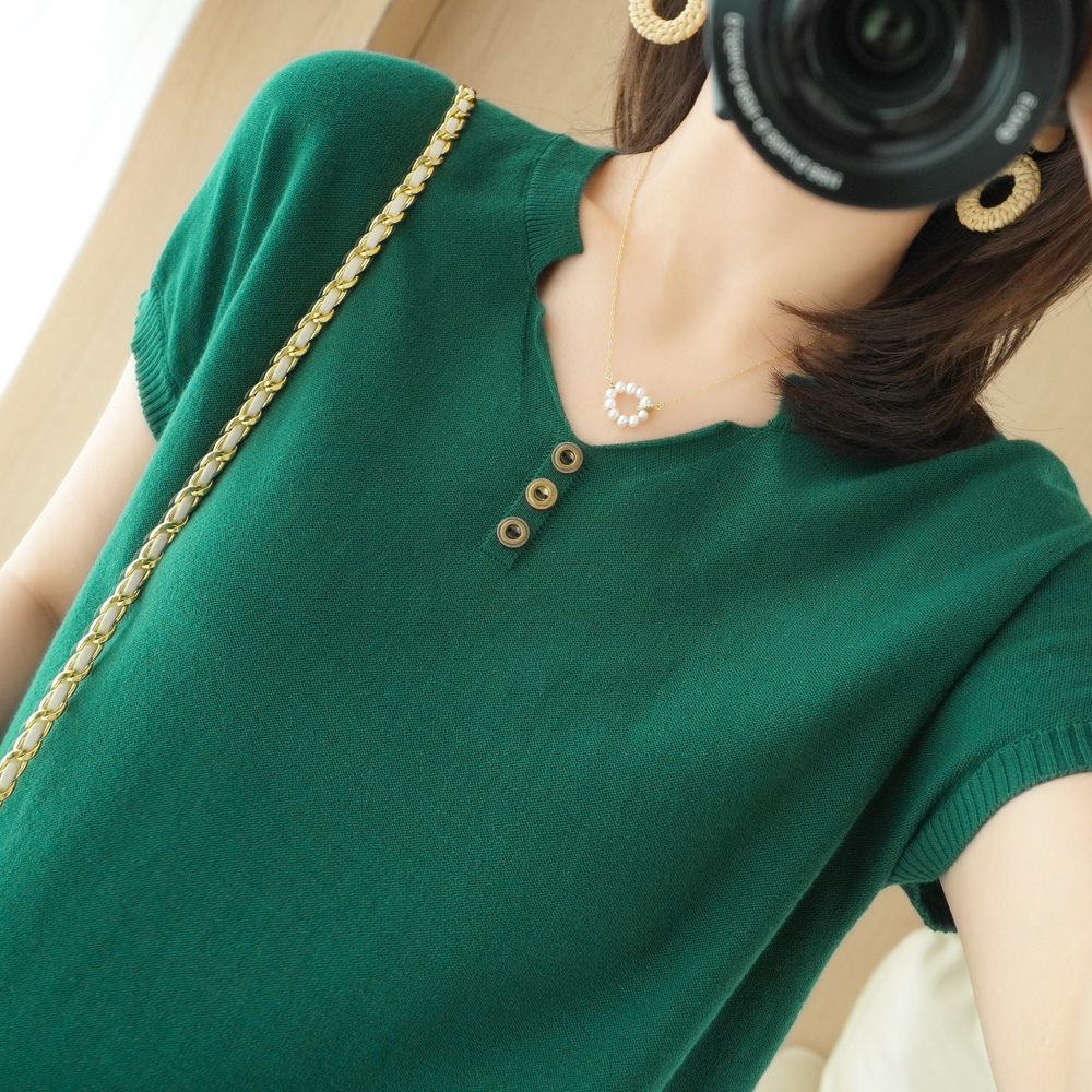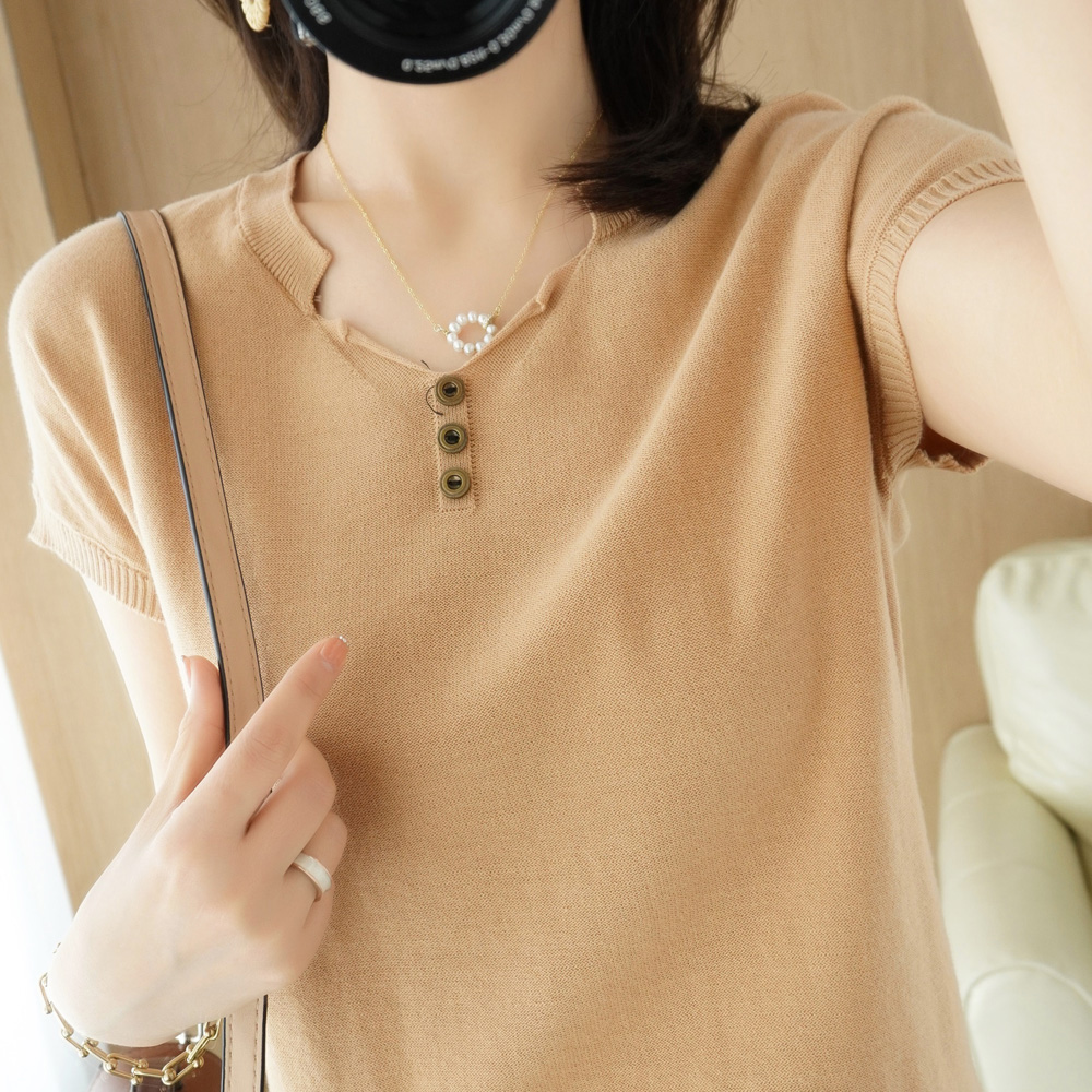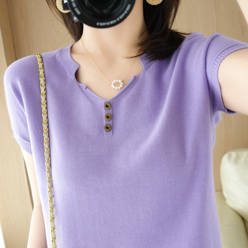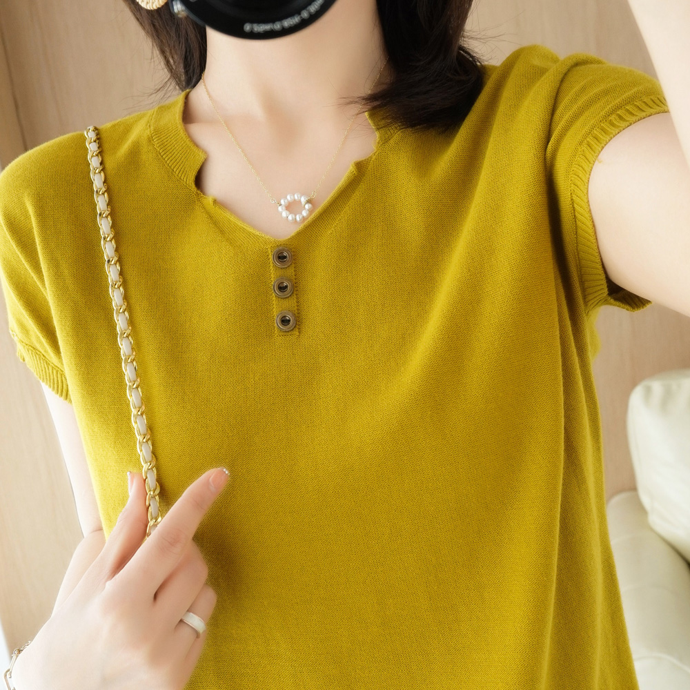T-shirt V collar loose inner lap female blouse 2022 Summer new pure cotton knit undershirt short sleeve cotton linen