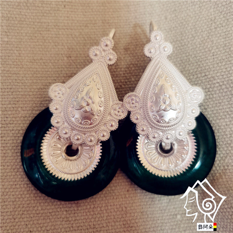 Sichuan Liangshan Yi Ethnic Earrings Pure Handmade Pure Silver Green Circle Retro National Wind Earrings Wedding Jewellery