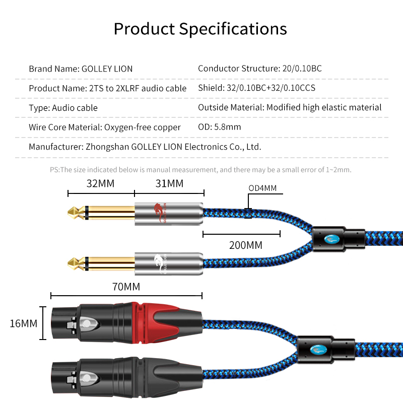 Golly Lion Double Canon Mother Go Double 6 5 Large Two-Core Audio Line 20% Two Power Amplifier Sound Mixer connecting line