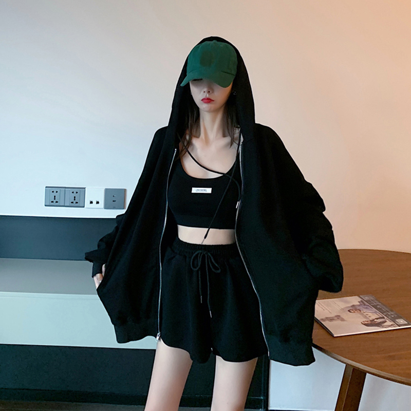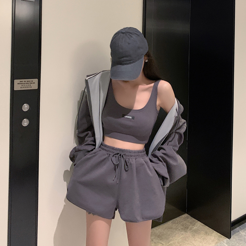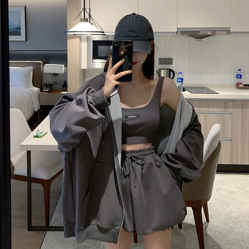 2022 spring and autumn high-end sense net red fried street casual sports sweater suit female small vest shorts three-piece set