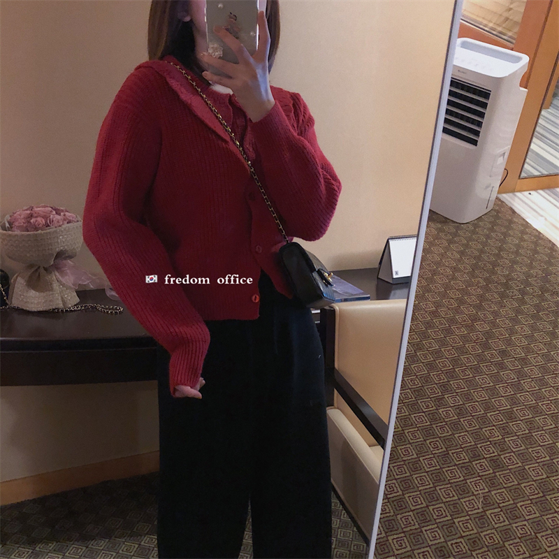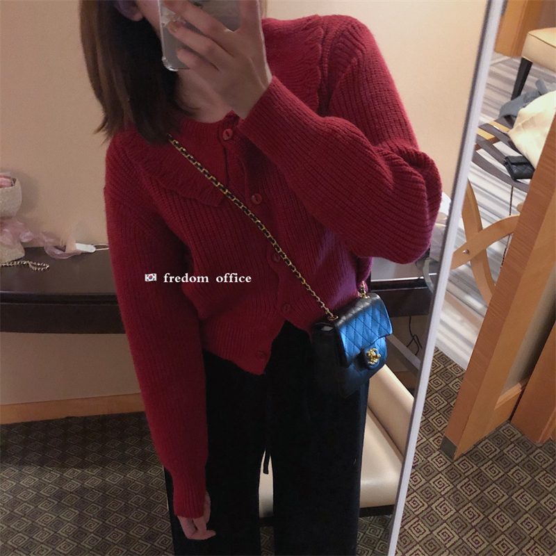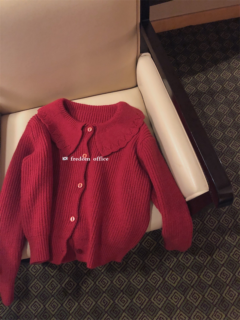 FREDOM New Year's red Christmas sweater women's autumn and winter natal year doll collar short knitted cardigan top clothes