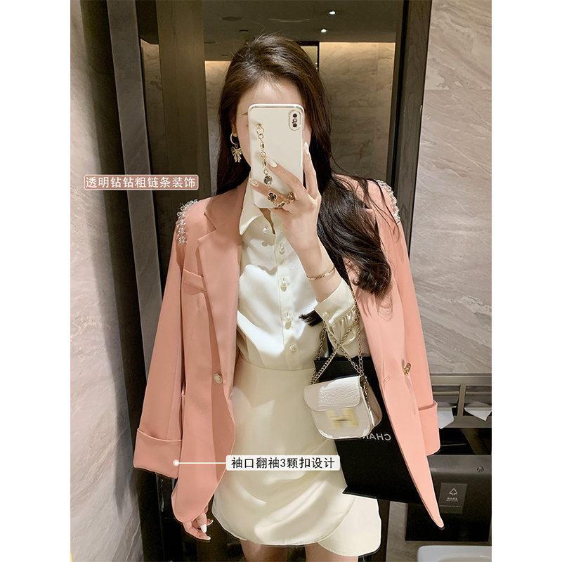 Fish Rabbit's Rabbit Temperament Pink Suit Women's All-match Suit 2022 Autumn New Beaded Straight Suit Jacket