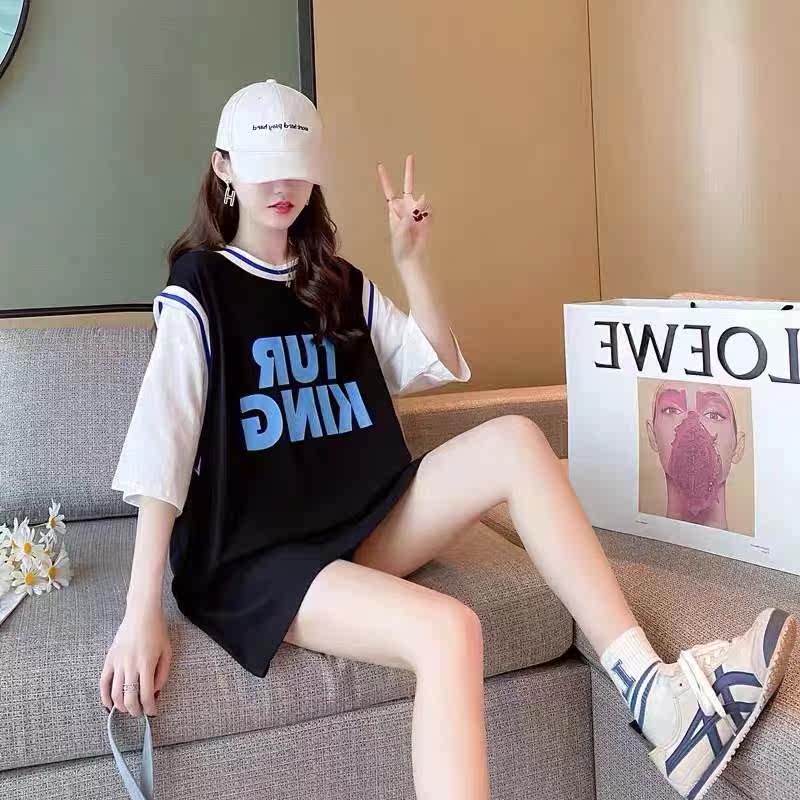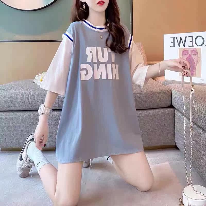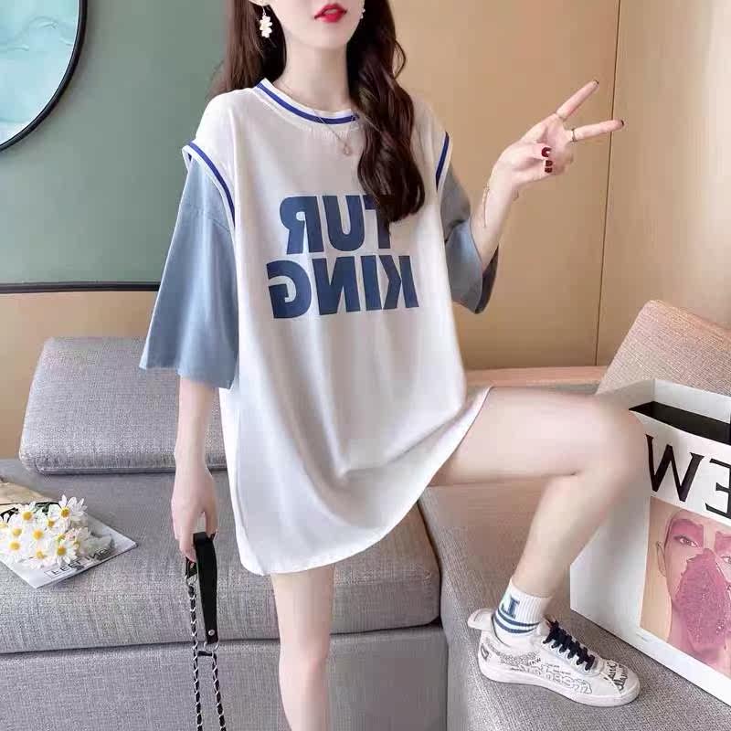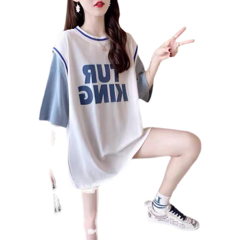 Pregnant woman short sleeve T-shirt out for summer clothing fashion big size ball clothes loose and fake two medium long spicy mother's blouse