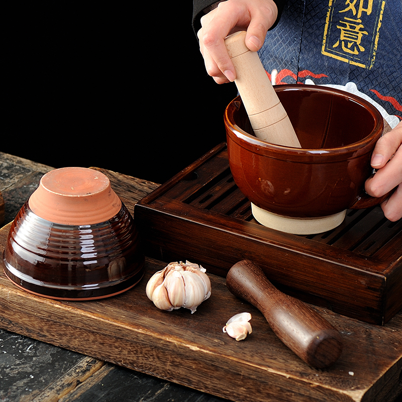 Old-fashioned garlic mortar, coarse pottery pounding bowl, pepper bowl, chili preserved eggs, garlic jar, garlic peanut grinder, wooden hammer bowl