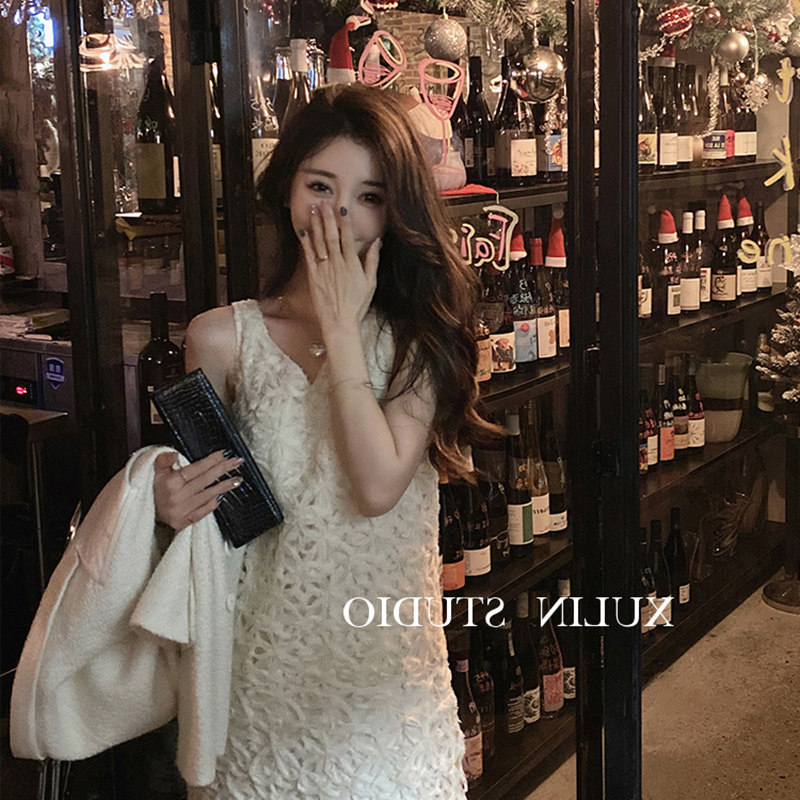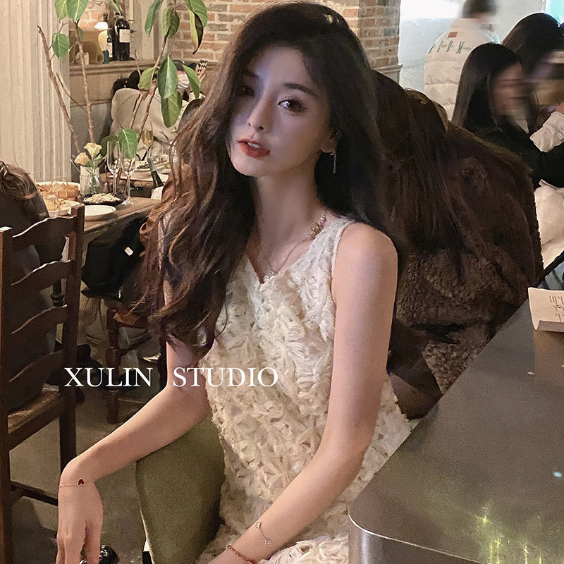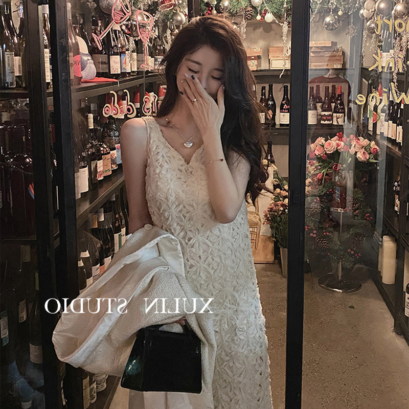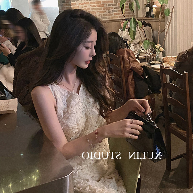 Solid disc with embroidered ocean dress Summer new style Temperament Advanced Sensuality Sensuality V collar sleeveless harness Long dress
