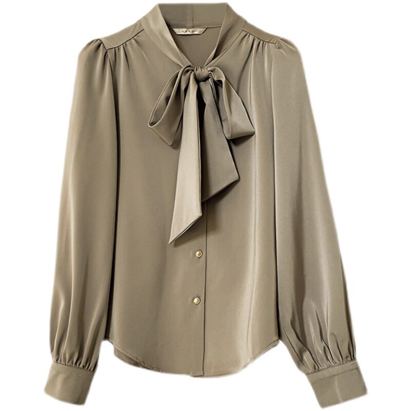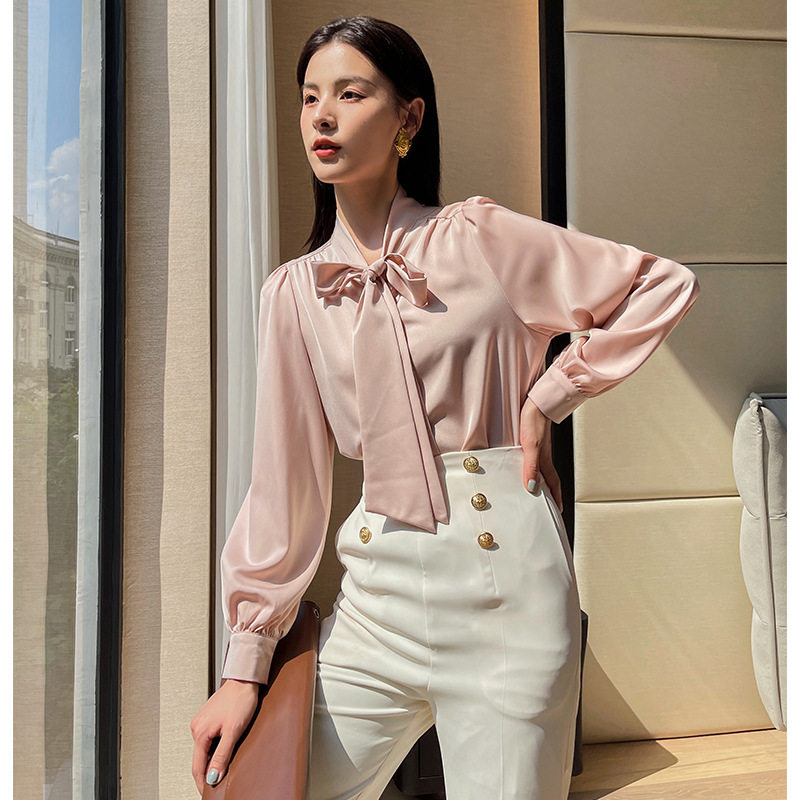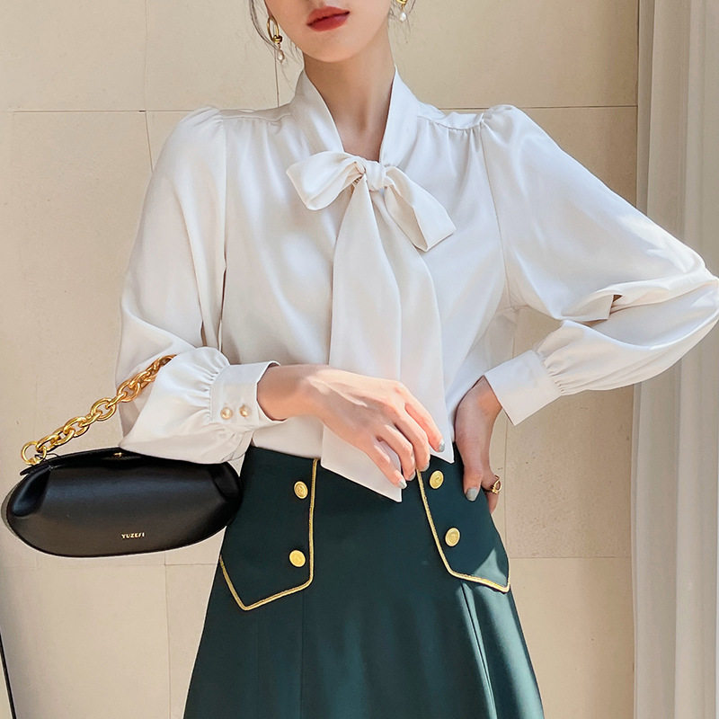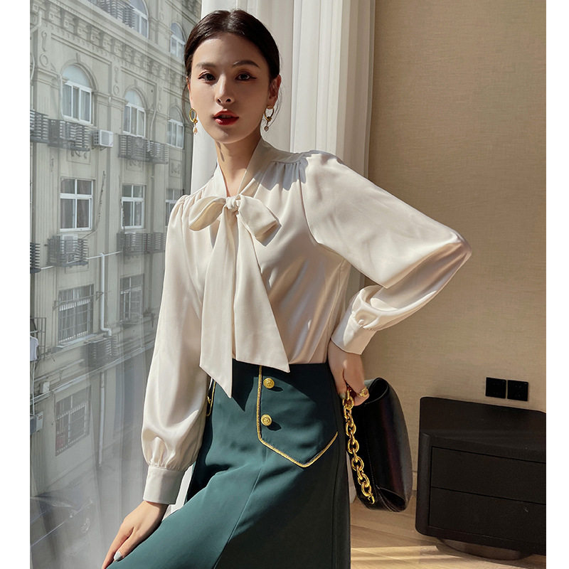 Maje Koce elegant white-collar fan tie shirt women's 2022 early spring French bow long-sleeved satin shirt
